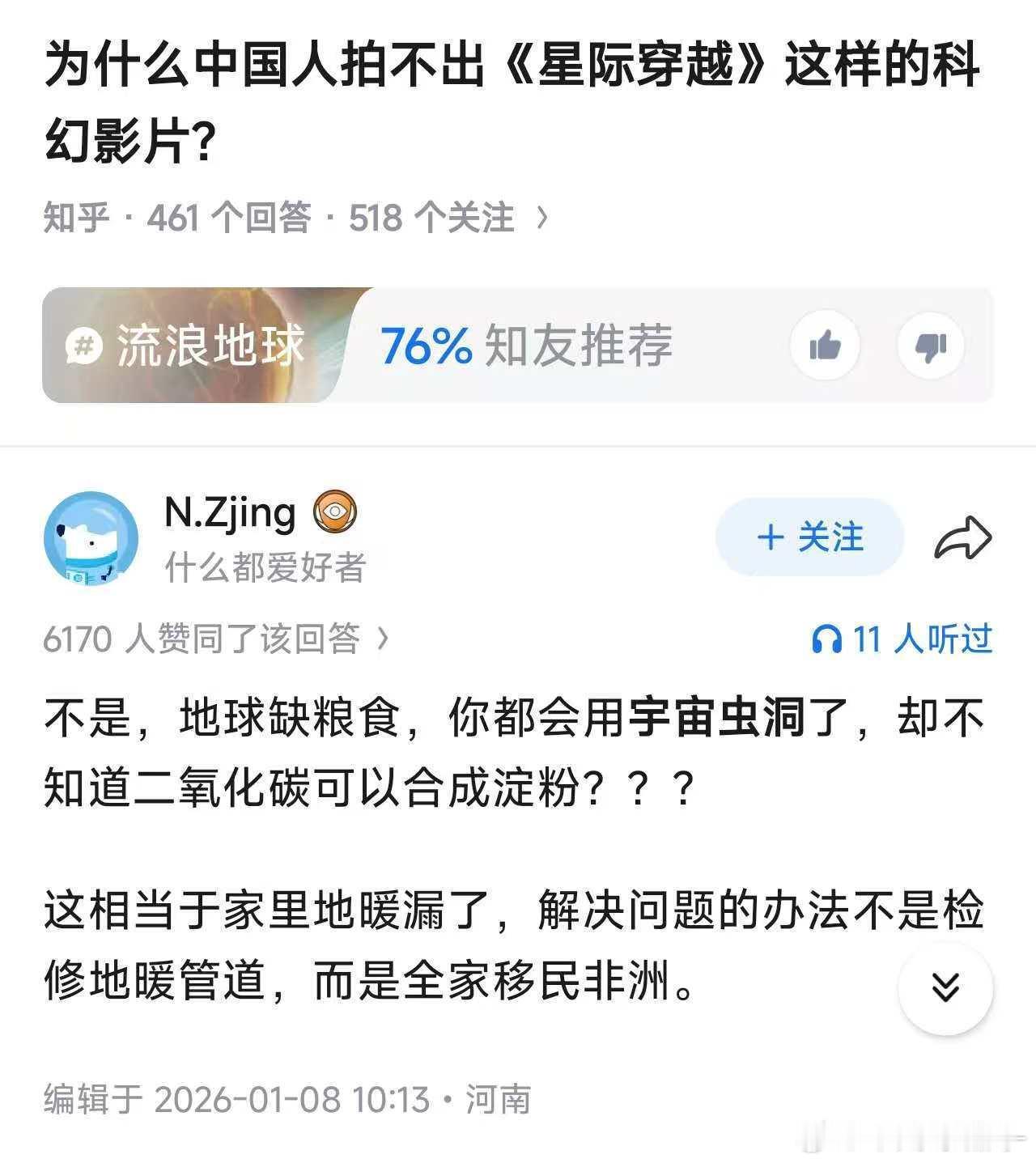地球缺粮不会等虫洞,会造太空农场;末日不会逃新家,会推地球流浪。不是拍不出《星际穿越》,是咱不信“神救世”,只信“人自救”!