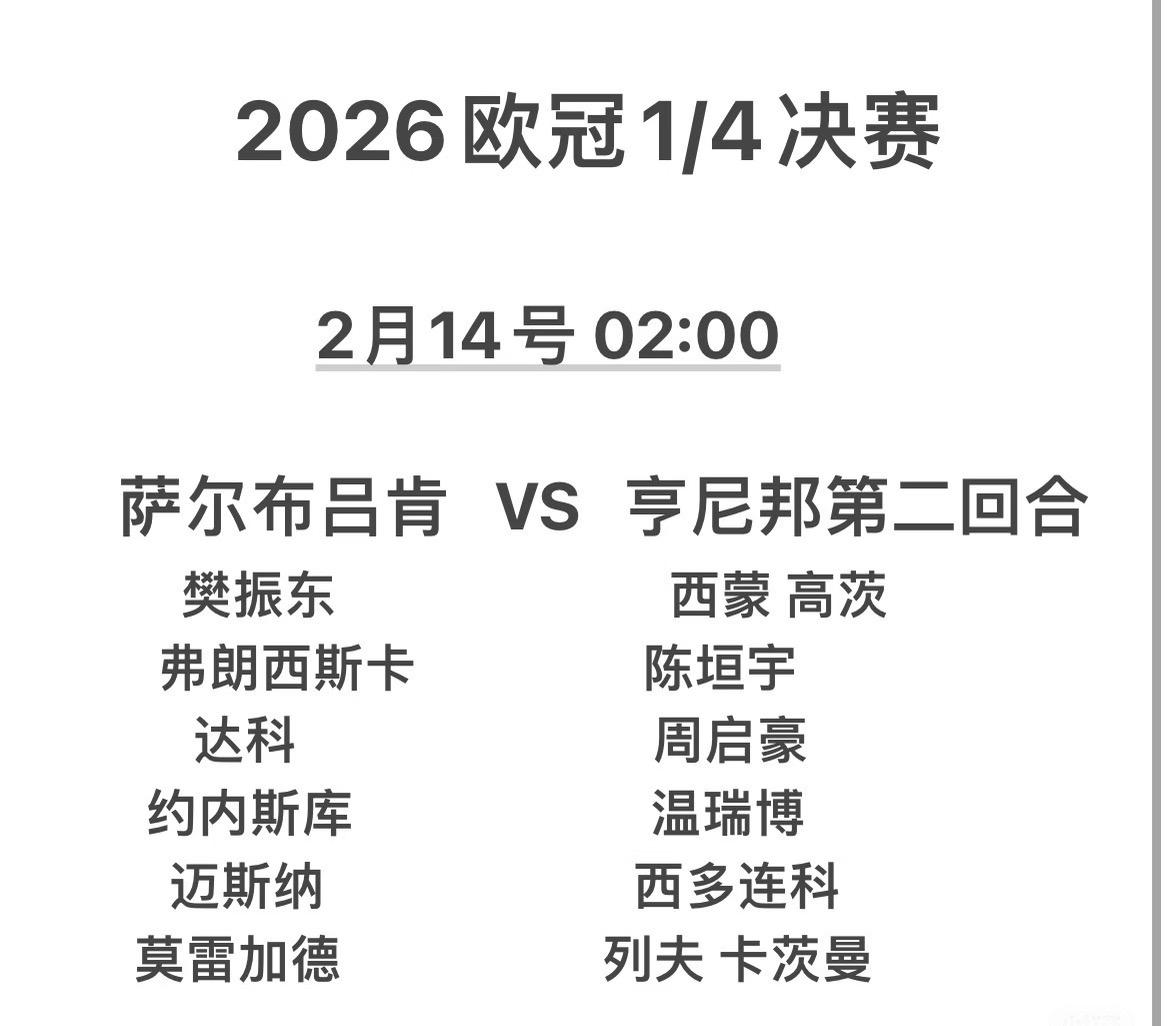 西蒙高茨分享欧冠1/4比赛场馆——国乒19小将温瑞博或将对战樊振东! 2月14日凌晨两点, 欧冠1/4决赛, 萨尔布吕肯VS亨尼邦, 阵容介绍, 欧冠1/4决赛, 萨尔布吕肯一定是志在必得, 所以一定将派出最强阵容, 樊振东 ,莫雷加德,弗朗西斯卡! 亨尼邦在阵容也非常强大, 西蒙高茨,陈垣宇,周启豪, 温瑞博,西多连科,卡茨曼, 协会规定, 只能上一名亚洲选手, 所以亨尼邦一定上温瑞博, 而且陈垣宇,周启豪正在备战新加坡大满贯,没有去欧冠。 温瑞博已经到达欧冠的比赛场馆, 希望樊振东不要遇到小温, 樊振东一单一定对战西蒙高茨, 樊振东加油, 温瑞博加油, 期待2月14日凌晨两点, 欧冠1/4决赛!