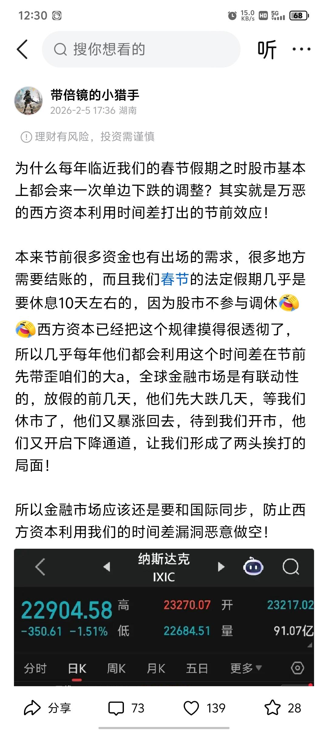 今天是最后一个交易日了,下跌是符合预期的,加之昨天美股大跌,昨天说了继续来给大家分享的,但有点私事要处理,所以来晚了点,所以参考答案可能就没有那么强势,昨天分享的十个目标最后居然板了6个,我自己都感到有点意外[呲牙] 但分享不是让大家来抄作业的,而是要通过参考答案去寻找里面的规律,否则永远也走不出迷宫的! 上个礼拜就说了,每年春节前都会有点回调,因为世界金融有联动性,西方资本总是利用时间差对我们打压,不信你看美股在我们春节休市期间肯定又要大涨,这种博弈换做你,你也会这么操作[呲牙] 还是保持个人观点,节后肯定是开门红,节奏还是围绕着电力和算力交替进攻,当然,大资金肯定是会围绕着产业链能动的,所以大家要学会如何去区分,是洗盘还是出货。 我教大家一个简单的方法吧,不管任何个股,它跌破5日线你就走,等到它企稳之后再去,这样至少不会套太深,也不至于错过他的主升,至于具体细节,就让大家自己去探索了! 年后再来给大家继续分享一段时间吧,能不能从我的分享中找到一些有用的东西,就看大家自己的领悟力了!