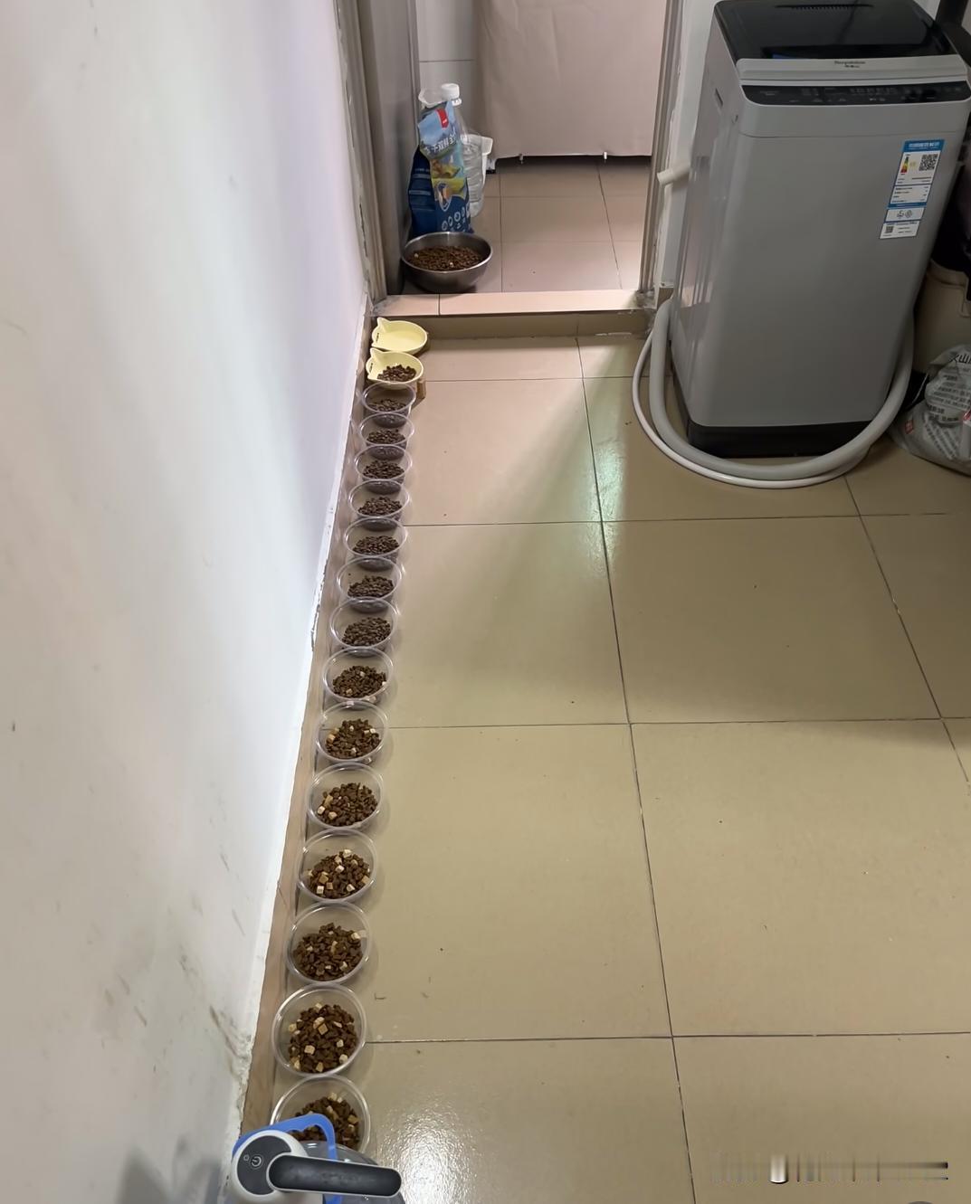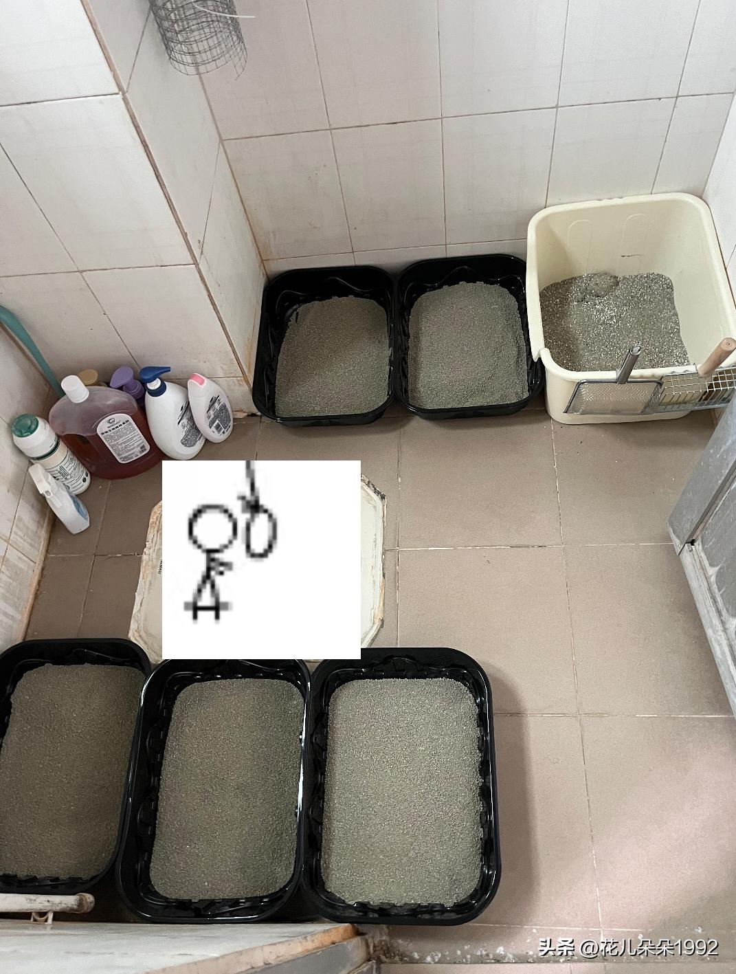 春节回老家,小猫留守在爸妈老房子,十五天这些够了吗? 四斤猫粮,六个猫砂盆,一桶水和一些分散装的水,爸妈单位老房子宽敞,这15天没人与它互动的话小猫可以在里面酷跑。