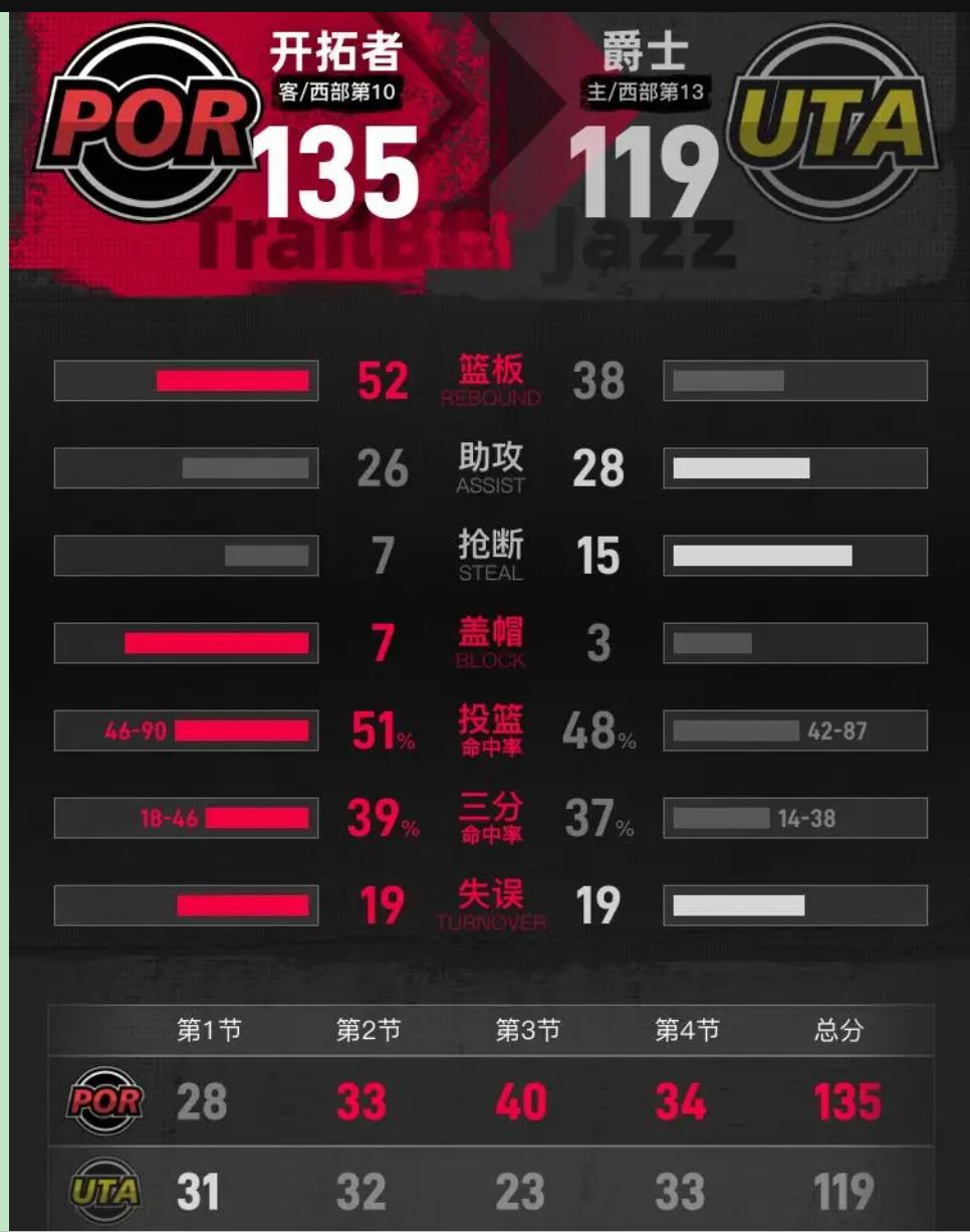 说好的摆烂呢?开拓者这帮"临时工"突然杀疯了,霍勒迪31分带队暴揍爵士,杨瀚森2分躺赢——这剧本是不是拿反了? 看比赛时我以为爵士主场稳了,结果第三节开拓者直接掀桌:单节40分,防得爵士像没头苍蝇。霍勒迪哪像34岁老将?冲起来比小年轻还凶!克林根23+18+7,这数据放中锋身上简直是"约基奇体验卡"。 但仔细琢磨,赢球真靠实力?爵士这防守跟纸糊似的:外线漏成筛子——霍勒迪三分线外一步没人贴,爵士还以为在打训练赛?内线被爆成渣——克林根抢18个板,爵士全队才4个前场板,篮板欲望还不如广场舞大妈抢地盘。森萨博28分空砍,进攻端猛如虎,回头一看正负值-20,典型的"数据我拿,输球你扛"。 开拓者赢球反而暴露隐患:亨德森15分但4失误,突破一根筋,眼里只有篮筐,未来核心?先学学啥叫"阅读比赛"。杨瀚森就捞到2分,虽说新人要交学费,但场均5分钟不到,练级呢还是看守饮水机?爵士更离谱:科利尔9助攻但防守梦游,全队助攻25次却丢135分,这年头不要防守的球队,真当自己是全明星表演赛? 我站开拓者这边。残阵打出血性,霍勒迪老将价值拉满,克林根让人眼前一亮——这哪是摆烂?分明是给管理层出难题:"还交易我不?我能带队赢球!" 爵士呢?重建不是瞎打,森萨博刷分有啥用?全队防守态度像在度假,主场输给缺兵少将的开拓者,教练组该集体开会扇自己两巴掌。 不过话说回来,比赛亮点倒是给球迷提神:克林根这手策应,中锋版"魔术师"有戏?霍勒迪用行动打脸:"谁说老将该打包送走?"爵士球迷也别丧,输球能保选秀签,但再这么防下去,状元签也救不了烂队文化! NBA无弱旅,摆烂可以,但别把脸丢光了。克林根23+18霍勒迪31+9 杨翰森2分开拓者胜爵士