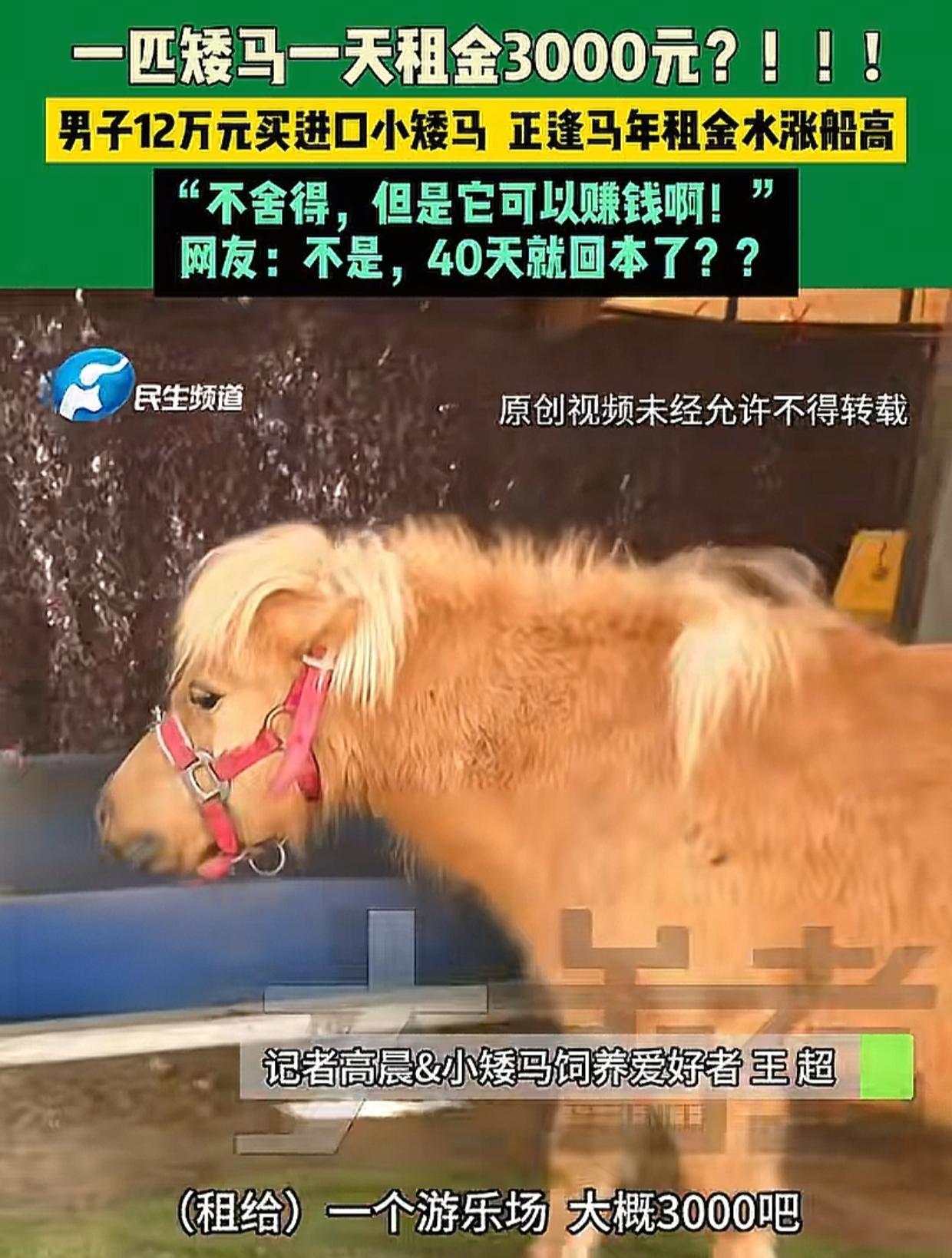 河南郑州,男子花12万买了一匹小矮马,趁过年租给一家游乐场,租金3000元。记者问:“一个月3000吗?”男子说:“一天!” 记者惊得张大嘴巴:“一天3000,你真是躺赢,这是‘马’上有钱!”男子笑笑说:“‘马’上有钱,过个好年!” 男子介绍说,这匹小矮马价格12万,说实话可真不便宜,他也是觉得太漂亮,实在太喜欢才买的。 记者开玩笑说,这么喜欢你还舍得租出去干活吗?男子表示租给游乐场就是给小朋友骑一骑,还有这么高的租金,他觉得挺好的。 看到视频,有网友说,一天3000,一个月9万,12万买的小矮马40天就回本了! 有网友说,这小矮马好像一台赚钱的机器,我好像看到了一个投资的新思路! 看得出,众多网友对男子出租小矮马的高收入艳羡不已,但说实话月赚9万只是一个伪命题。 今年正好是马年,马成为被喜爱追捧的动物,又加上过年大家都舍得消费,小矮马才会有这么高的租金。 但春节假期一过,节假日溢价消失,小矮马的租金大概率会水落船低,所以说这么高的租金在一年中只是“昙花一现”。 再加上除去购买的成本,小矮马一年还需要场地,饲料,护理等不少费用,这对于很多人来说很难成为一个稳赚不赔的投资。 不过如果像男子一样是一个小矮马爱好者,出于喜欢才喂养,又捎带着挣点儿钱,就是一件皆大欢喜的事儿了,大家说呢?