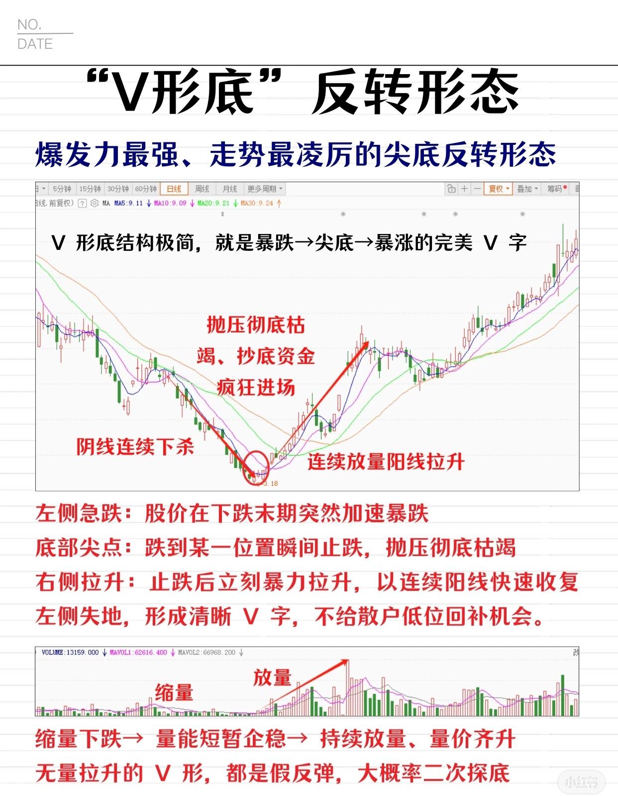 本次介绍“V 形底”反转形态,其为爆发力与走势最强最凌厉的尖底反转形态。结构是暴跌 - 尖底 - 暴涨的 V 字,左侧急跌、底部尖点抛压竭,右侧放量拉升。量能表现为缩量下跌 - 短暂企稳 - 持续放量齐升,无量拉升多假反弹,大概率二次探底。