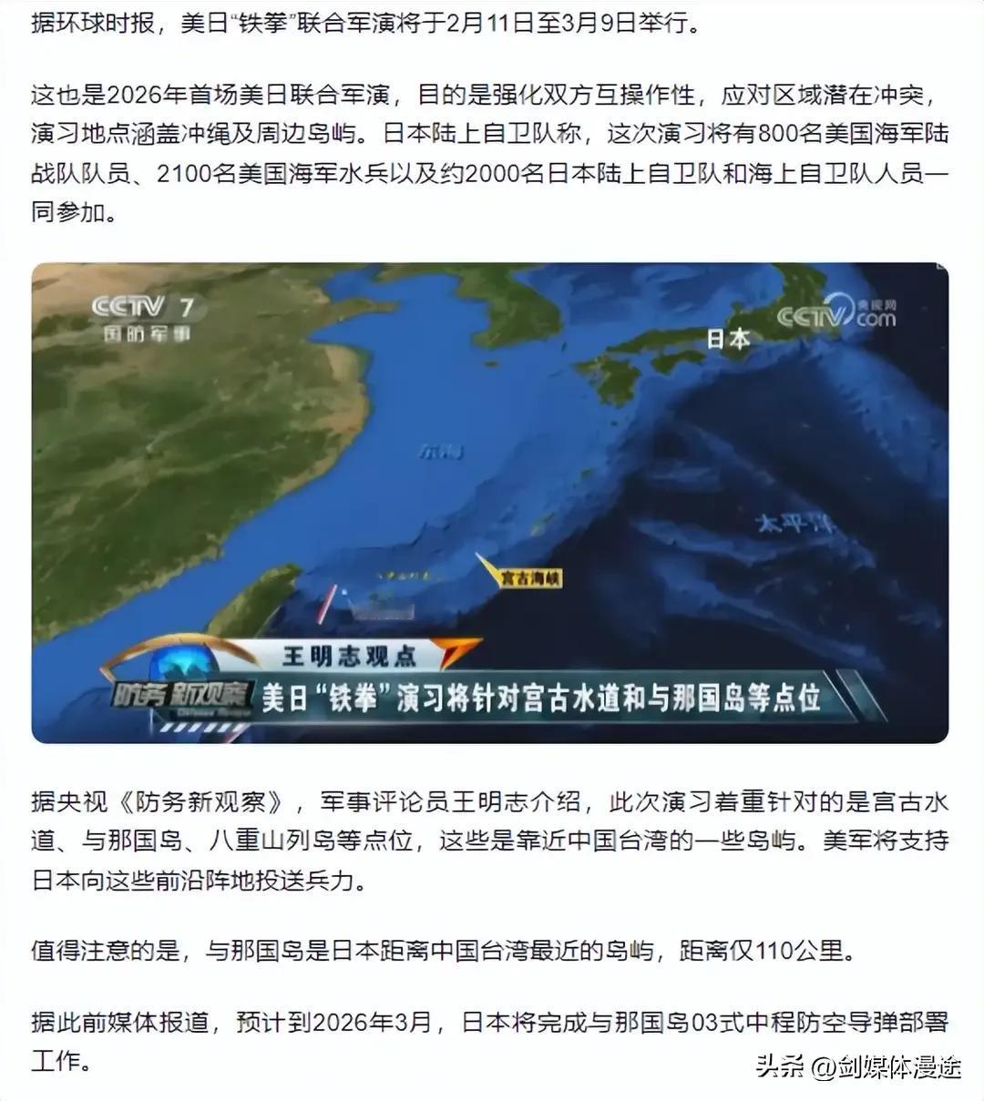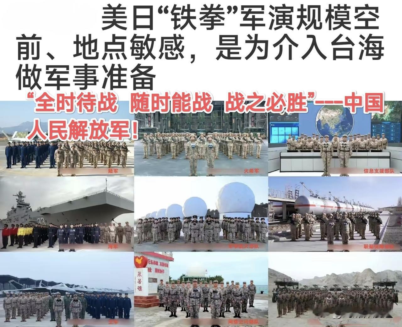 正逢中国春节之际,美日“铁拳”军演是美日【狼狈为奸】的集中体现!破坏中国的欢庆,企图介入台海 美日各怀鬼胎!中国人民解放军更是“枕戈待旦”护家国平安!以全时待战 随时能战 战之必胜的坚强决心与敢拼刺刀之精神 保家卫国! 美日铁拳军演 5000 人的规模 最近与中国台湾 110 公里的家门口。这一场军演足以打脸特朗普所谓的:与中国关系友好,处理台湾问题由中国说了算,不寻求与中国发生冲突等胡弄的“鬼话边篇”,以证明了特朗普表面一套背后一套毫无诚信可言,介入台海 美国正在这么做! 同时“铁拳”军演,再次证明了高市所谓的“台湾有事 日本有事”的危险言论 破坏一个中国 威胁中国安全 也代表了日本政府正在这么做,而高市只是一个“揭幕”之人!介入台海 日本一直在这么做! 为此美日在此时狠败为奸 美国与日本没有想撤退 也没有收缩,而是以退为进,将日本打造成对抗中国的主力,而美国正在用军火将台湾武装台“豪猪”,将台湾变成火药桶。就是要破坏中国的国家统一大业。军演绝非单纯的防御性训练,而是美日绑定推进印太战略、针对台海及第一岛链的实战化军事部署,释放出强烈的军事对抗信号! 如今的特朗普就是破坏中国统一大业 的真正推手,一方面表面上要与中国友好 更多是为了获得取美国利益,另一方手拿武器随着准备破坏中国统一大业 ,美国就是一个两面三刀的面孔。 所以说中“铁拳”军演,“演习地点紧贴台海周边,将日本西南诸岛打造成前沿军事支点,意图通过联合战力构建,为介入台海事务做军事准备。这种以邻为壑、制造对抗的行径,完全违背亚太地区求和平、谋发展的主流意愿,只会将地区推向更危险的边缘。”这也足以说明,美国对中国所说的话,全都是谎言,更企图用谎言来糊弄中国,以达到阻止中国之目的。特朗普太天真的,高市早苗太幼稚了! 美日“铁拳“军演选择在中国“万家灯火 庆团圆”之际,这足以说明美日没打算让中国人民好好过日子,不过咱们的人民解放军更是“枕戈待旦”护家国平安!以全时待战 随时能战 战之必胜的坚强决心与敢拼刺刀之精神 保家 卫国! 陆军某旅2营、海军安徽舰、空军航空兵某旅、火箭军某旅、军事航天部队某部、网络空间部队某部、信息支援部队某中心、联勤保障部队某仓库、武警部队某支队 9 个单位 战略值班身后的“大杀器”就明白,中国人民的过年可以安心!中国075 两栖攻击航 歼-20 第五代隐身战斗机 航天部队的“天眼”,火箭军东风-100 超音速巡航导弹 (7 大车 14 枚),攻-XX 无人机战斗群 。从西北大漠 到群山大川 从陆地 到南海大洋 从地面到天眼卫星 从后方保障联群 到 一线前沿阵地 已经全部随时准备着!当然中国手上还有列加强大的“杀手锏”武器应有尽有! 请首长放心 请人民安心 国家安全有我们在,请全国人民放心!精神饱满、士气高昂, 时刻盯紧 不放过一丝一毫的异常。