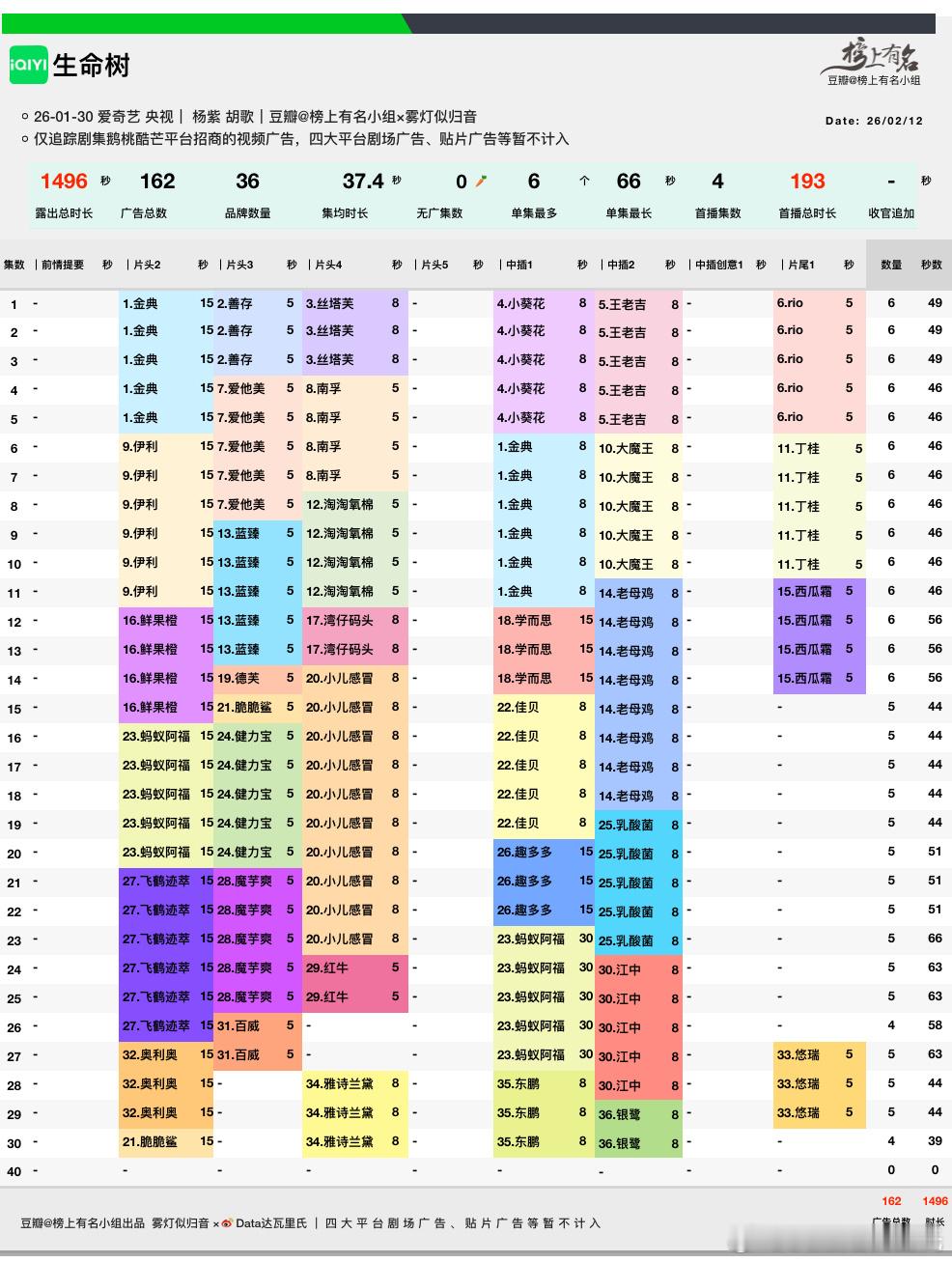 生命树招商应该是播前就招好了,所以现在保持很好。开播前说41品牌,现在已经有36个视频广告。已播30集,总时长1496s