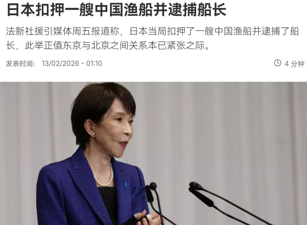 非常嚣张!日本对中国渔船进行扣押,并逮捕船长! 2 月 13 日,根据法新社报道,法媒称日本当局扣押了一艘中国渔船并逮捕了船长。这起事件并非简单的渔业执法纠纷,从日方披露的细节来看,事发海域位于长崎县五岛市女岛西南约 170 公里处,日方出动了 4 艘执法船对中国渔船实施围追堵截,最终强行扣押船只并逮捕 47 岁的中国籍船长,船上其余 10 名船员的处境也备受关注。 值得注意的是,这是日本水产厅今年首次扣押外国渔船,也是 2022 年以来首次针对中国大陆渔船采取此类强硬行动,在中日关系本就持续承压的节点上,日方的这一做法无疑是火上浇油。 日方此次执法的核心依据,是声称该海域属于其所谓的 “专属经济区”,但这一主张从一开始就站不住脚。 根据《联合国海洋法公约》,在海域划界尚未达成共识的情况下,任何一方都无权单方面划定管辖范围并实施执法,而中日之间对于相关海域的专属经济区划界始终存在争议。 中国一贯主张按照公平原则,结合海岸线长度、人口状况等实际情况进行划界,而日本却顽固坚持不合理的 “中间线” 原则,此次在双方未划界的海域单方面采取执法行动,本身就是对国际法准则的无视和践踏。 更让人难以接受的是,日方的执法行为充满了双重标准。 翻看日本水产厅的年度报告,去年其仅扣押了 2 艘外国渔船,今年却突然对中国渔船采取如此激进的手段,背后显然有更深层的考量。 近期日方在涉华问题上动作频频,从在台湾问题上发表错误言论,到在东海海域不断制造事端,一系列行为都在不断触碰中方的底线,而此次扣押渔船事件,不过是日方近期一系列不友好举动的延续。 事实上,中国驻日大使吴江浩此前就明确指出,当前中日关系面临邦交正常化以来最为严峻复杂的局面,责任完全在日方。 日本国内的右翼势力不断鼓吹错误论调,试图突破战后国际秩序的约束,在涉华核心利益问题上屡屡挑衅,这才是导致中日关系紧张的根本原因。 而此次日方借渔业问题发难,本质上是想通过制造事端转移国内矛盾,同时迎合其追随美国搞 “印太战略” 的政治诉求,这种做法既不理智,也不明智。 对于此次事件,中方的立场十分明确,中国不承认日方在该海域单方面划设的专属经济区主张,日方的执法行为缺乏法律依据和事实基础。 目前,中国相关部门已经高度关注此事,相信会采取必要措施维护中国渔民的合法权益,要求日方立即停止错误做法,放船放人并作出合理解释。 当下,中日关系正处于关键的十字路口,日方的每一个举动都将影响两国关系的走向。 希望日方能够认清形势,摒弃错误做法,停止在东海海域制造事端,回到对话协商解决分歧的正确轨道上来,否则,由此产生的一切后果,都必须由日方全权承担。 而对于中国而言,无论外部形势如何变化,维护国家主权、安全和发展利益的决心始终坚如磐石,中国有足够的能力和手段,保护每一位中国公民和中国渔民的合法权益。