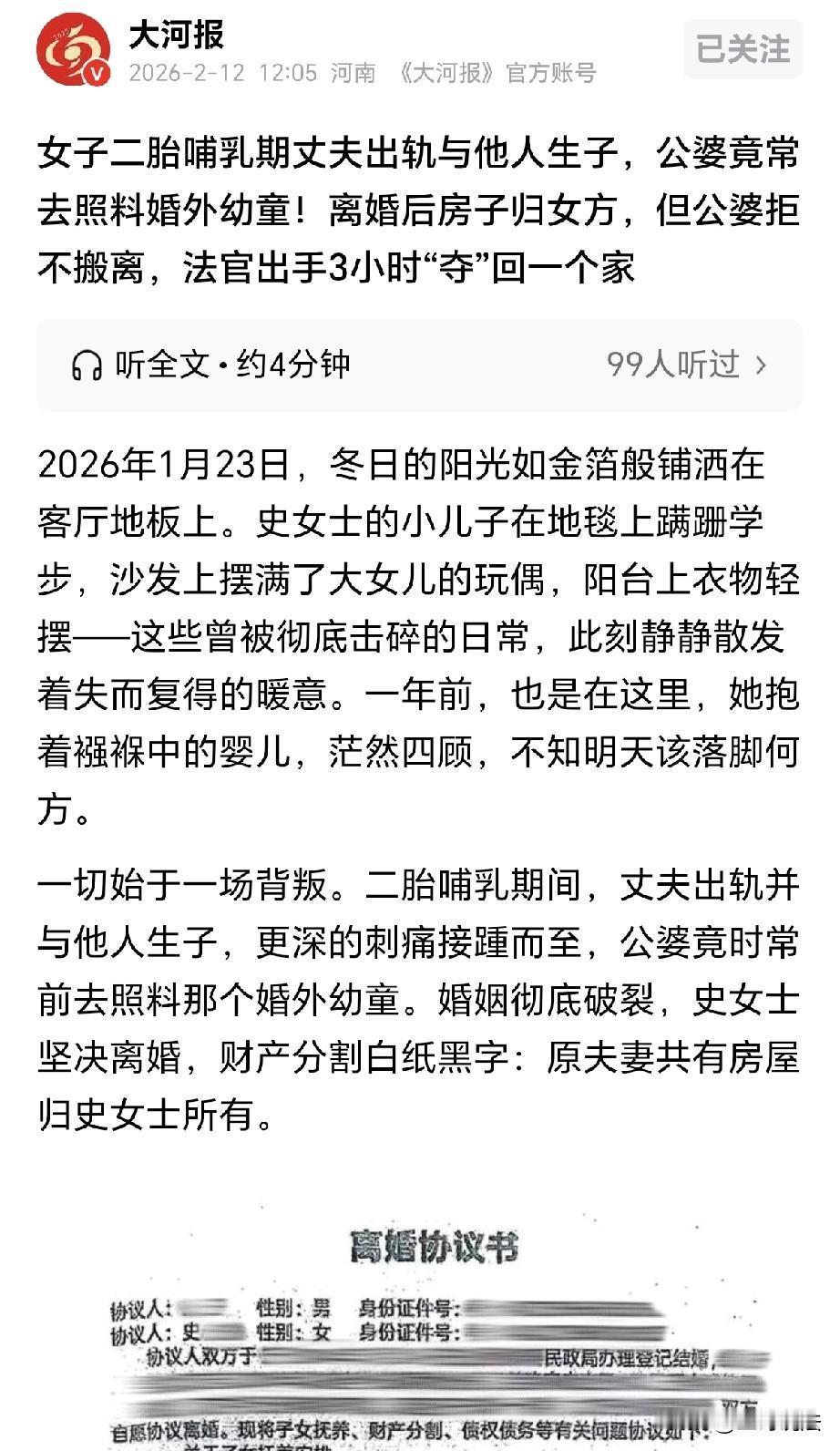 北京,一女子生完二胎,发现丈夫出 轨,还和别人生了孩子,公婆心知肚明,还去照顾那个婚外孩童,女子坚决离婚,房子归她所有,谁知公婆占着不走,女子孩子无处栖身,女子无奈之下,给法院打电话: 我带着两个孩子,请帮帮我,我快撑不住了,结果令人动容! 史女士千辛万苦,这才生下了二胎,儿子抱在怀里,她满怀欣慰给孩子喂奶。 谁知她突然发现,丈夫早就出轨,还和别人生了孩子。 史女士感到天旋地转,那夫妻恩爱的场景一一从脑海里浮现。 如今看来,这一切都是假的,丈夫朝三暮四,早就在她不知情的情况下和别人生了孩子。 史女士看着襁褓里的儿子,她大哭了一场,本来想着公公婆婆能为自己主持公道。 可真相往往更加的残酷,她跟踪追究,发现公婆心知肚明,早就知道他们儿子出轨的事情。 而这一对父母,不以为耻,反以为荣,觉得自己儿子有本事,婚里婚外都有女人为他生孩子。 公公婆婆瞒着史女士,经常去照顾那个婚外的孩子,在他们眼里,那也是自己的孙子,让他们不管,那是绝对不可能的。 史女士肝肠寸断,这才知道自己究竟嫁了个什么样的家庭,有这样的父母,必然就会有丈夫那样的儿子。 他们不负责任,没任何的愧疚底线,至于史女士这个媳妇,反正你已经生了2个孩子。 2个孩子足够能把你拴死,至于丈夫出轨的事,你怎么看都没问题,你接受也要接受,不接受也得接受,毕竟你手心朝上,还要指望丈夫养你。 可史女士刚烈,绝不能容忍这样的屈辱,有孩子咋了,有孩子我也要和你离婚! 史女士坚决离婚,很快就办了离婚手续,夫妻共同的房子归她,以后夫妻陌路,再无半分情分。 可理想是美好的,现实却给了她重重一击,公公婆婆不愿意了,凭啥我儿子的房子要给你? 在他们眼里,史女士夫妻打拼来的财产都是他们儿子挣的,既然离婚,你一分都休想带走! 他们老两口盘踞在屋里,就是不走,反正我们年纪大了,就不相信你还能把我们咋样? 史女士和他们讲道理,恳求他们搬走,恢复自己的平静生活。 老两口不搬,找了各种的借口,到了最后,又是调解,又是报警,可无论如何,公婆依旧赖在屋中。 史女士抱着孩子,在寒风中颤抖,背后就是她的房子,可是她就是住不进去。 她冷的瑟瑟发抖,孩子在襁褓中哇哇大哭,她离了婚总算是摆脱了那个自私的丈夫,不想却被前公公婆婆为难成这样。 史女士走投无路,各种途径都已经使用过,谁见了老两口谁都摇头,这一对赖子,还是不走。 史女士忍无可忍,她哭着拨通了法院的电话,电话接通,工作人员心头一紧! 只听见电话那头传来声音: “我带着两个孩子,请帮帮我,我快撑不住了……” 工作人员立刻意识到这事情不对,这是一个母亲绝望的求助。 他们立刻出发赶往史女士说的房屋,他们敲开门去,屋里一片狼藉,扔的乱七八糟。 那一对公婆住在里面,当法院工作人员问起,他们口口声声,说他们要是当天搬离这里,东西就没地方放了。 之后他们又说,他们要回老家,但是买回老家的票总需要几天时间。 工作人员一一点头,这些借口他们立刻解决,工作人员表示,如果你们同意今天搬离,我自掏腰包,为你们解决两晚的住宿。 话说的没错,你们只要搬走,我给你出房费! 法院工作人员一身正气,他们的脸上带着威严,既然房子已经归史女士所有,任何人未经同意都不能强占她的房子! 这是底线,绝不是妥协,工作人员语言震慑,一丝机会都不给他们。 经过3个小时的僵持,最终前公婆害怕了,工作人员以理服人,并向他们表明法律的威严! 到了最后,公婆开始收拾行李,不大一会,他们就拿着行李从房间里走开。 房子失而复得,史女士顿时嚎啕大哭,她的委屈这一刻得到了释放,有法院给她撑腰,她啥也不怕了。 他们的恪守职责,坚守底线,让史女士要回了房子,让她在遭遇背叛离婚,带着孩子,房子被占的绝望走了出来。 史女士定做了旌旗,给法院工作人员们送去,锦旗上两行大字: 铭心不忘法理人情 鼎力誓卫正义道德 ! 《民法典》第235条规定: 无权占有不动产的,权利人可请求返还原物。 史女士已合法取得房屋所有权,前公婆无正当理由强占,属于无权占有。 法院有权责令他们搬离,保障房主对房屋的占有、使用权利,这是最基础的物权保护。 《民事诉讼法》第259条规定: 离婚协议或判决已生效的,当事人必须履行。一方拒不履行的,另一方可申请法院强制执行。 前公婆拒不腾房,史女士可以申请强制腾退,法院依法采取措施,维护生效文书的权威,保护弱势方的居住权益。 法律既护财产权,也守护弱者底线,无论是婚姻过错还是亲属身份,都不能成为侵占他人房产的借口,生效裁判必须执行,这是法治的底线! 对此,你怎么看?