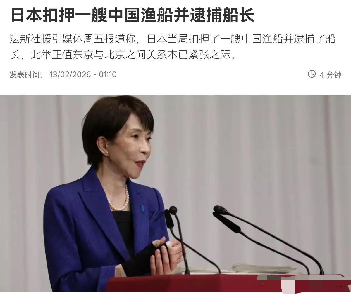 非常嚣张!日本对中国渔船进行扣押,并逮捕船长!2月13日,根据法新社报道,法媒称日本当局扣押了一艘中国渔船并逮捕了船长,此举正值东京与北京之间关系本已紧张之际。日本渔业厅表示,该船在日本长崎县(西南部)外海的“专属经济区”内无视停船命令。中国船长接到渔业检查员的停船检查命令,但该船未予配合并逃离现场。因此,船长被逮捕。 这事儿没那么简单。日本水产厅通报说得挺客气,什么“无视命令”“逃离现场”,实际上是一场赤裸裸的武力示威。为了对付一艘渔船,日本一口气派出了“白鸥丸”“白萩丸”“武藏”“那之津”四条执法船。四条船加起来两千多吨,对付一艘渔民小船,这不是执法,这是打仗。目的就是为了抓人扣船,制造轰动效应。 为什么非要在这个时间点动手?钓鱼岛那边折腾够了,换个地方搞摩擦。日本首相高市早苗刚上台没多久,急着向美国展示强硬姿态。扣押渔船成本最低,既能对内煽动情绪,又能试探中国的底线。说白了,这就是一出精心编排的政治秀。 日本宣称事发海域在长崎西南170公里的专属经济区(EEZ)。这个地方水深得很,根本不是大陆架,早就超出了日本宣称的合法管辖范围。说白了,日本这是在强行把自己画的线当成边界线,试图蚕食中国的传统渔场。这种单方面主张,中国从来就没承认过。 这次日本直接抓人,性质完全变了。过去几年,双方在争议海域还有点默契,一般就是驱离了事。这次直接逮捕船长,意味着日本撕毁了过去的“游戏规则”。这不仅仅是在欺负中国渔民,更是在挑战中国的海洋权益底线。日本想用这种极端手段,逼中国在划界问题上让步。 面对这种挑衅,中国必须强硬回击。光发个抗议声明没用,得来点实际的。日本最怕什么?怕中国海警直接去那个海域常态化巡航,怕中国的反制措施打到他们的痛处。中国渔民在祖宗海捕鱼天经地义,容不得外人撒野。日本敢抓人,中国就敢让他们付出代价。 各位读者你们怎么看?欢迎在评论区讨论。