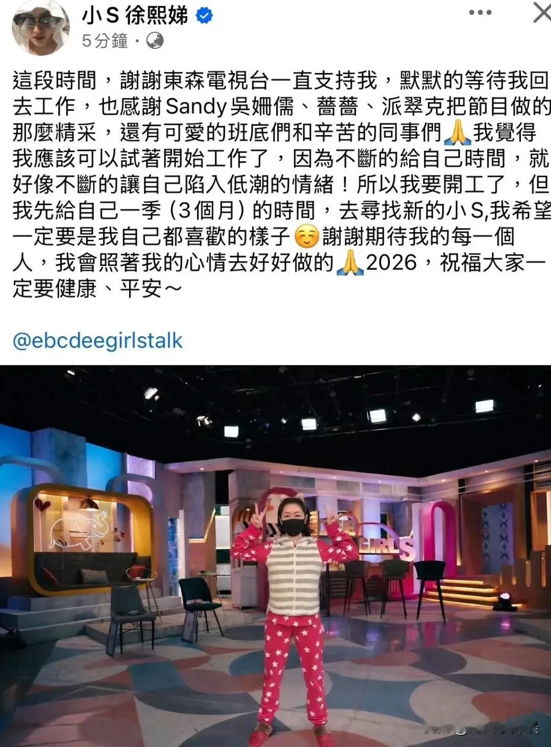 小S复工!盼望来内地 姐姐大S去世一周年后,终于传来小S有心想要复工的消息,这对她的粉丝观众来说无疑令人惊喜!小S还回复评论说到:“我也很想来内地。” 但是后半句话未说。 在这段时间里,小S由于处理家事和伤心过度,申请停工,小S的节目由吴宗宪的女儿替她代班。 但是就像伟忠哥说的那样,人还是要工作的,而且更要好好工作!徐家以前也都在舆论中心,之前都是事业强势才得以立住,只有有作品,才能更好保护家人,熙娣加油![赞]