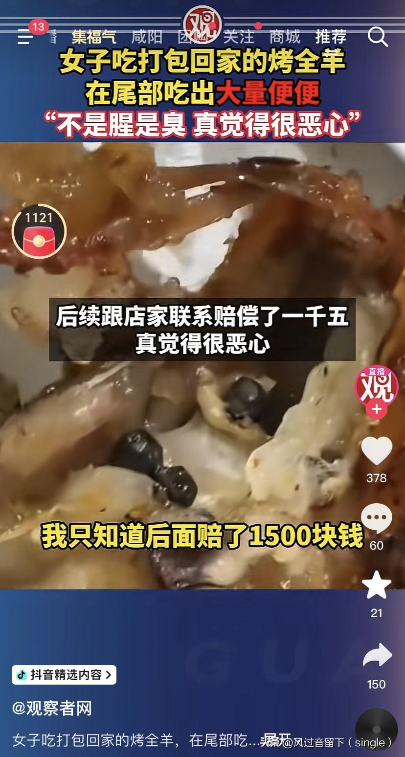 这烤全羊还加了料了。 2月8号,四川内江一女子打包一份烤全羊,回家在烤全羊尾部吃出了大量羊粪蛋,这女说不是腥是臭,感觉真恶心。 于是就赶紧联系商家,商家只给赔了1500块钱。 要加料是加的调料,而不是羊粪蛋! 看来店家在处理羊的时候根本就没处理干净,这真的太恶心了,虽然商家赔了1500块,但是我感觉这个事不能完。 这事是个大事,毕竟是食品安全问题,不能因为就简单赔个钱就完了,应该好好整顿,好好反思为啥会出现这情况!