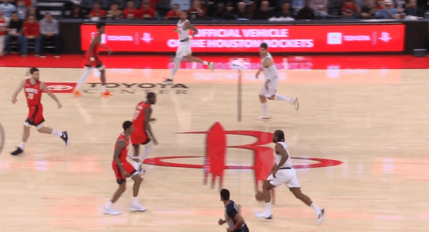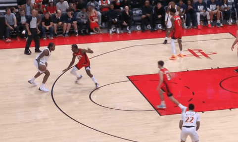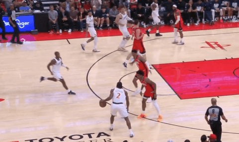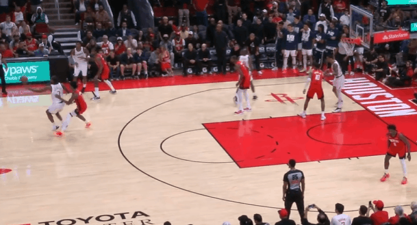 P5队友清空上线,伦纳德持球单打伊森。连续的单打前置后,右手大力炸球启动右路突破,行进间遭遇谢泼德前来夹击立即合球,双手将球钳住抱入怀中从二人之间的缝隙穿过,随后直接起高抛投终结,迎着双人干扰颠进篮筐。慢动作细节呈现:P6