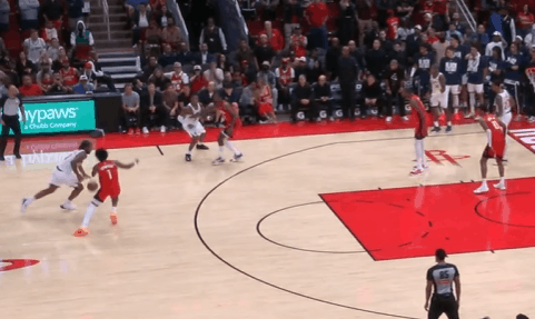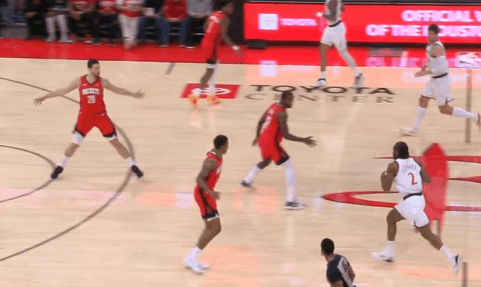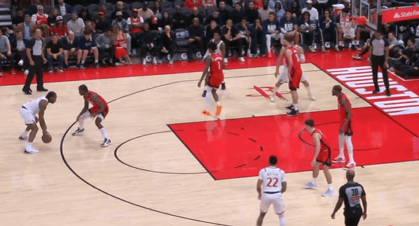 P3伦纳德持球推进至前场后落位右翼,随即与邓恩发动边路挡拆配合:借助邓恩扎实的掩护挂住追防的阿门后,见贾巴里选择高位沉退——垫步急停后坚决出手持球三分,予以打击。慢动作细节呈现:P4