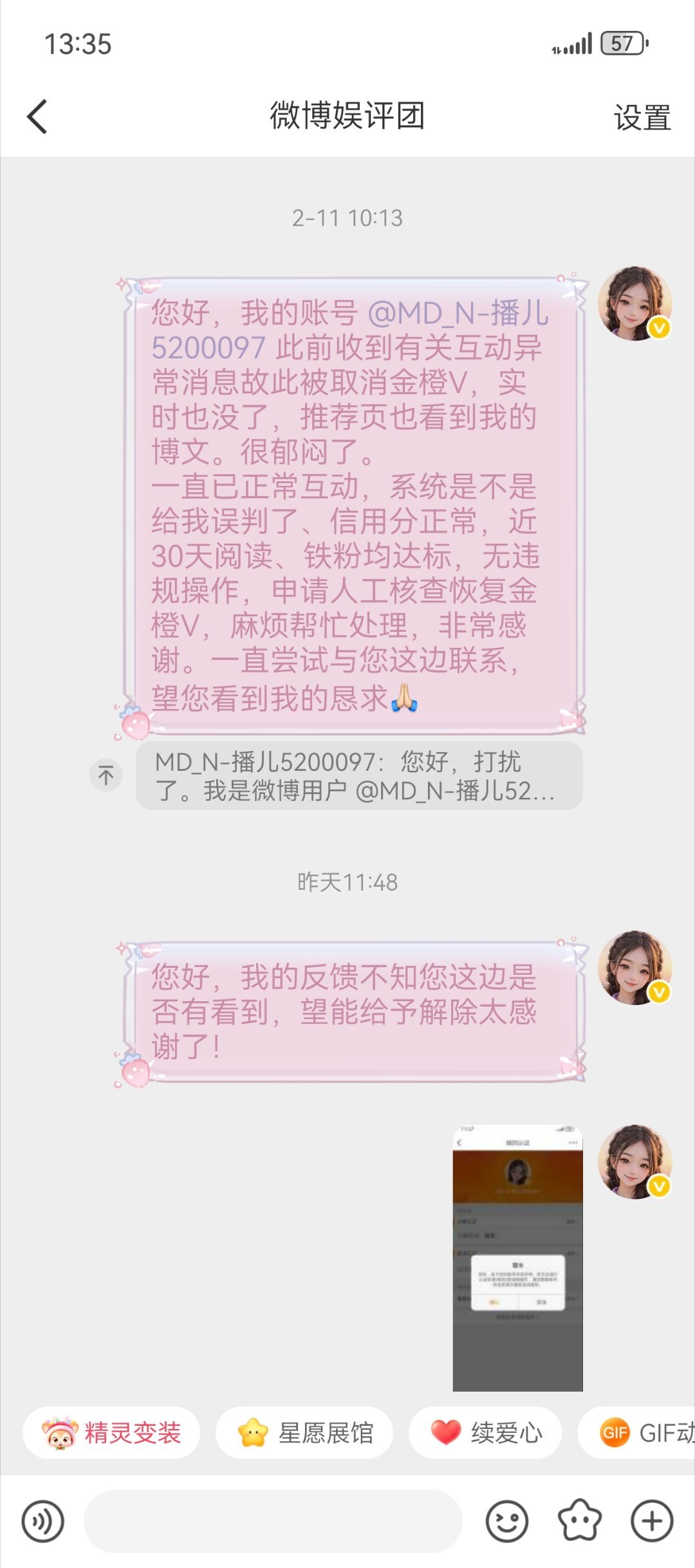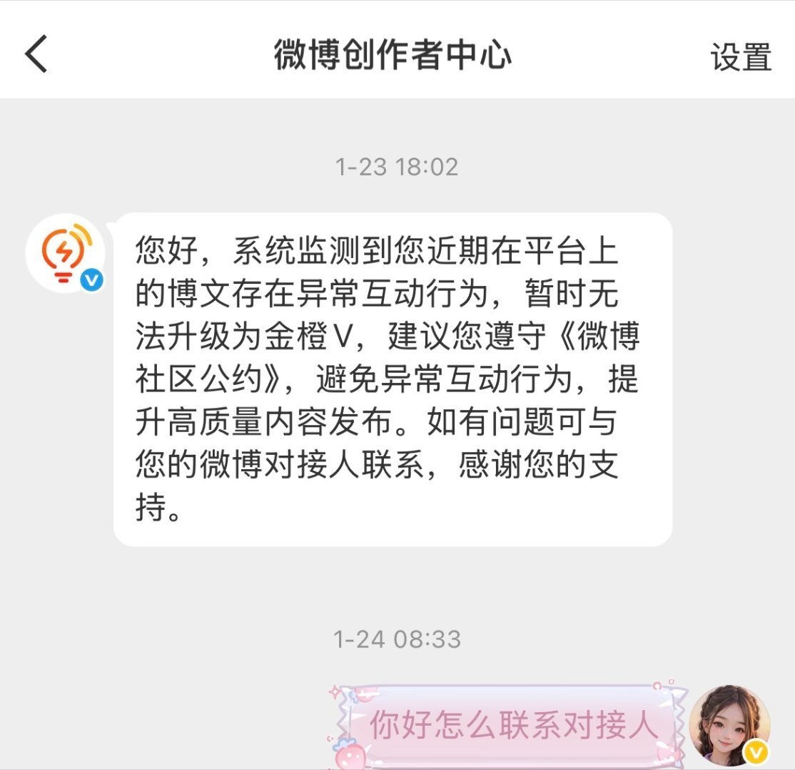 【账号申诉】您好,我的账号 因“互动异常”被误判取消金橙V,实时功能消失,推荐页也无法正常展示我的博文。一直保持正常粉丝互动,无任何违规操作,信用分正常,近30天阅读、铁粉数据均已达标,与人工客服咨询需找相对领域对接,但多次与领域对接私信协助,都无回复。恳请进行人工核查,恢复此账号相关功能。