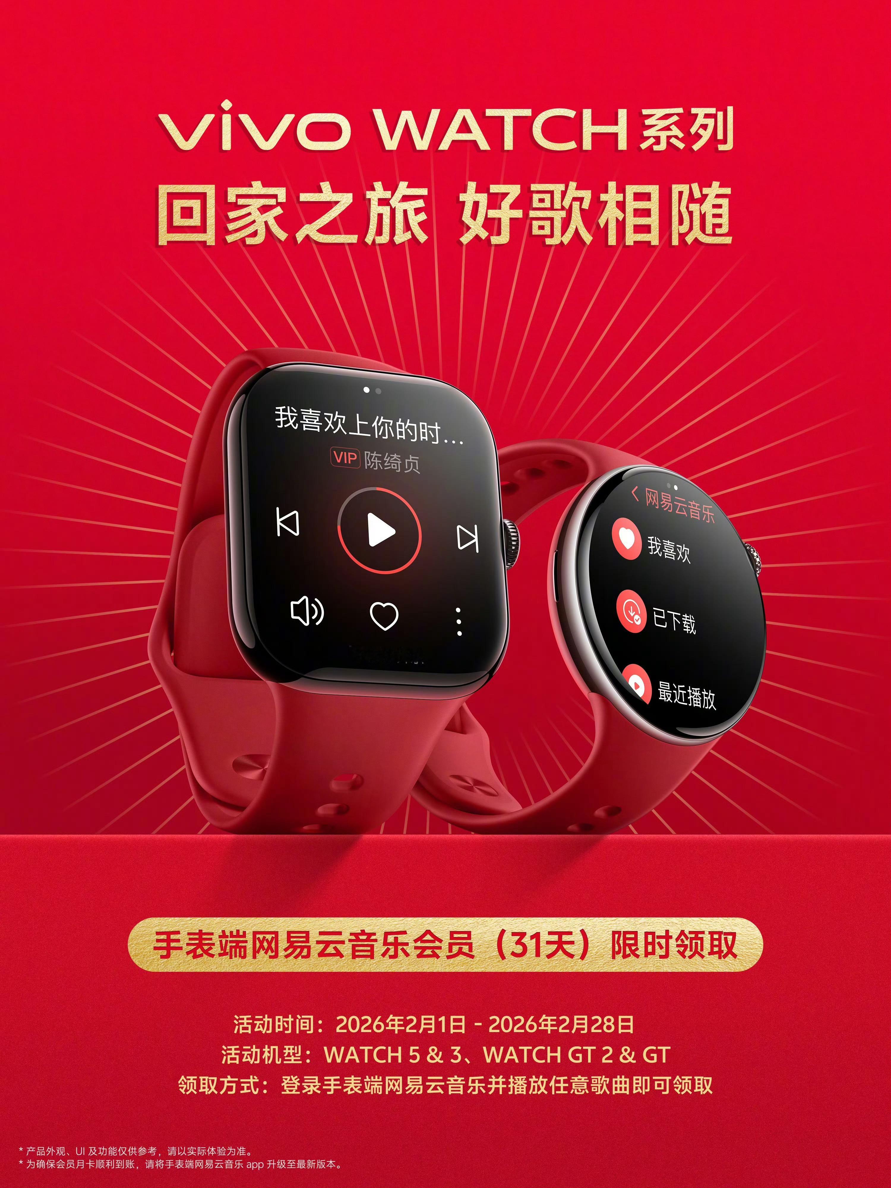 宝子们!2月1号到2月28号,用 vivo WATCH GT 2 或者 vivo WATCH 5 登录手表端网易云音乐APP!