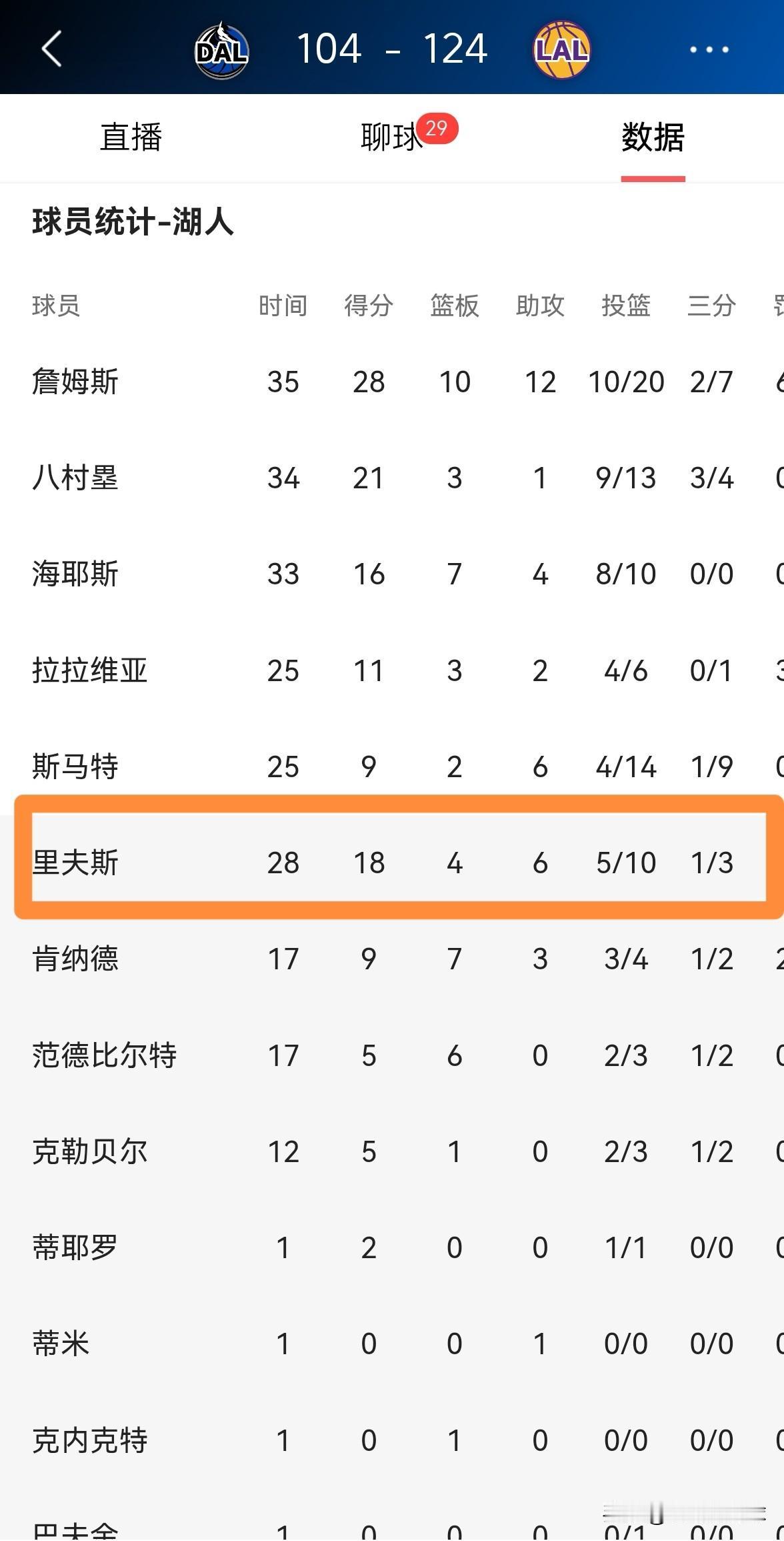 湖人超级后卫里弗斯真是太懂事了!在今天湖人主场以124:104大胜独行侠的比赛中,里弗斯在独行侠缺兵少将的情况下没有痛下杀手,全场比赛下来,里弗斯在替补出战的28分钟里,仅仅出手10次得到18分4篮板6助攻。 毫不夸张的说,以里弗斯的得分能力来看,如果里弗斯在此役全力以赴的话,独行侠起码要输30分。