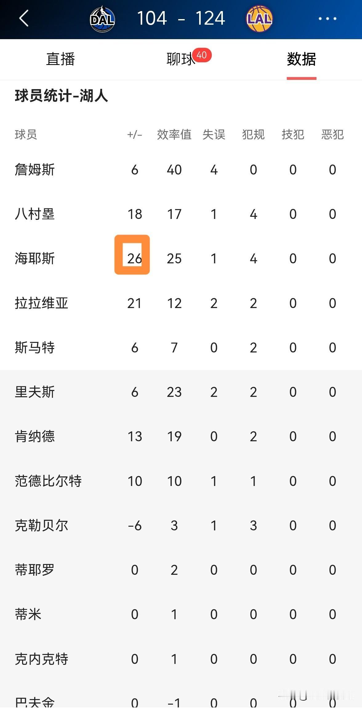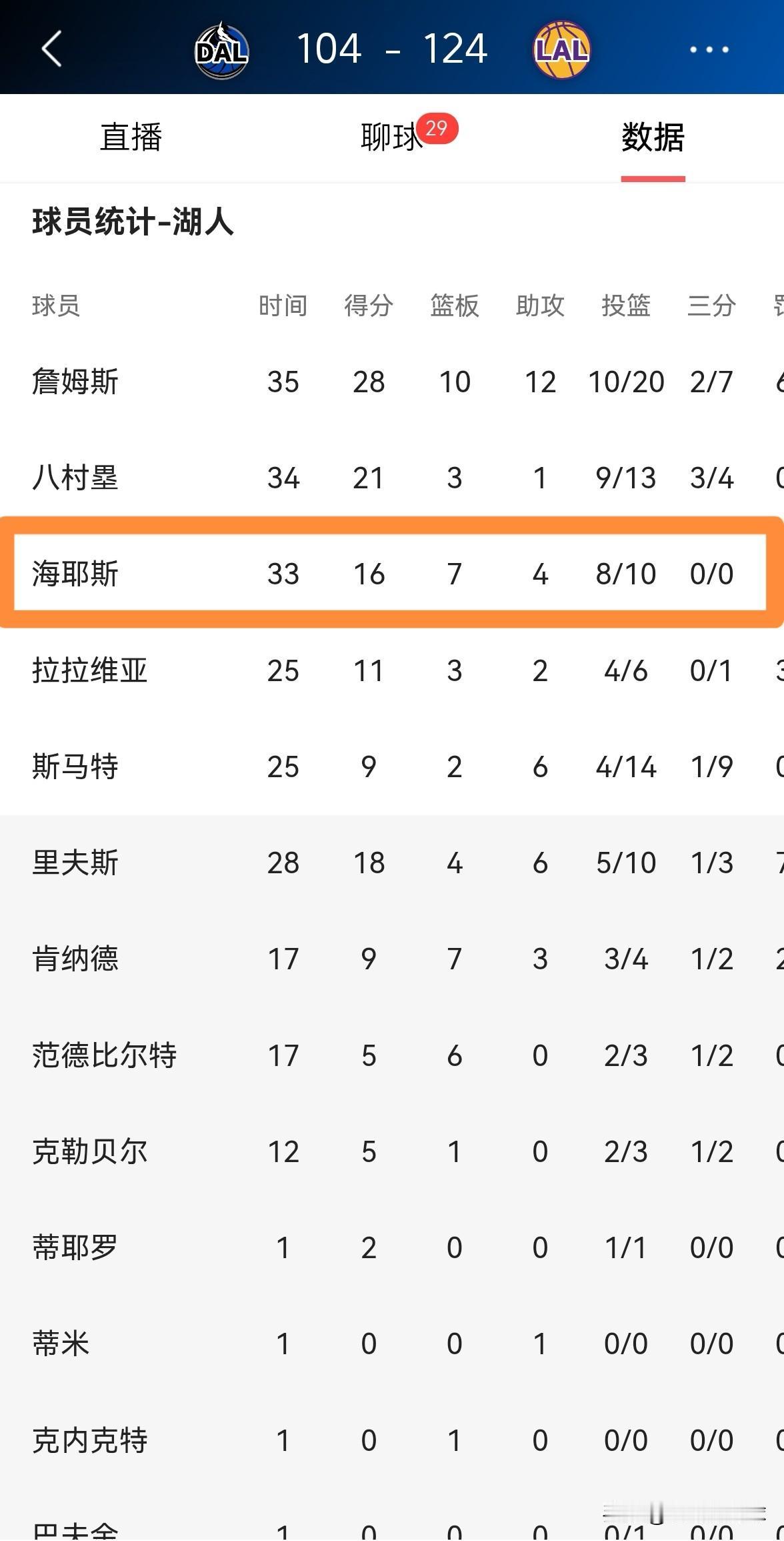 湖人大将海斯真是让人赞不绝口!在今天湖人主场以124:104轻取独行侠的比赛中,海斯在攻防两端都打出了非常惊艳的表现,为球队提供了巨大的帮助。 整场比赛下来,海斯首发出战33分钟,投篮10中8极其高效的砍下16分,外加7篮板4助攻3抢断1盖帽,他的场上正负值为全队最高的+26。 老实说,以海斯在本场比赛中的精彩表现来看,他配得上任何的赞誉,他是湖人能够获得一场大胜的关键球员。