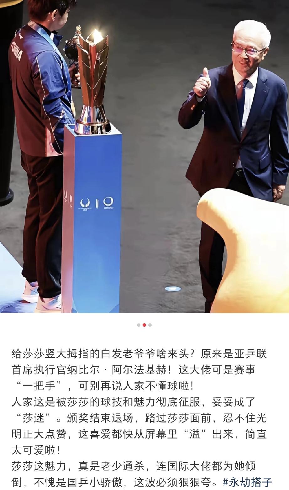 看谁再说这老头不懂球! 质疑亚洲杯女单颁奖大赛,给莎莎点赞的白发老人到底懂不懂球。看看这老头履历。 亚乒联首席执行官比尔.阿尔法基赫,大佬可是赛事一把手。对球研究的透透的。 能把大拇指伸给莎莎,那除了偏爱还有对她实力的认可。 莎莎这魅力,简直老少通杀,国际大佬都为她吸引,不愧是国乒的小骄傲!