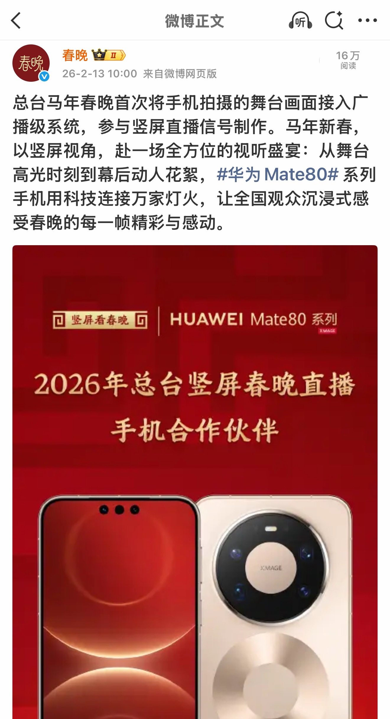 华为Mate80系列携手2026总台春晚,实现手机拍摄画面接入广播级系统,竖屏直播解锁春晚新体验原来现在手机也能直播春晚了第一次见春晚用手机直播