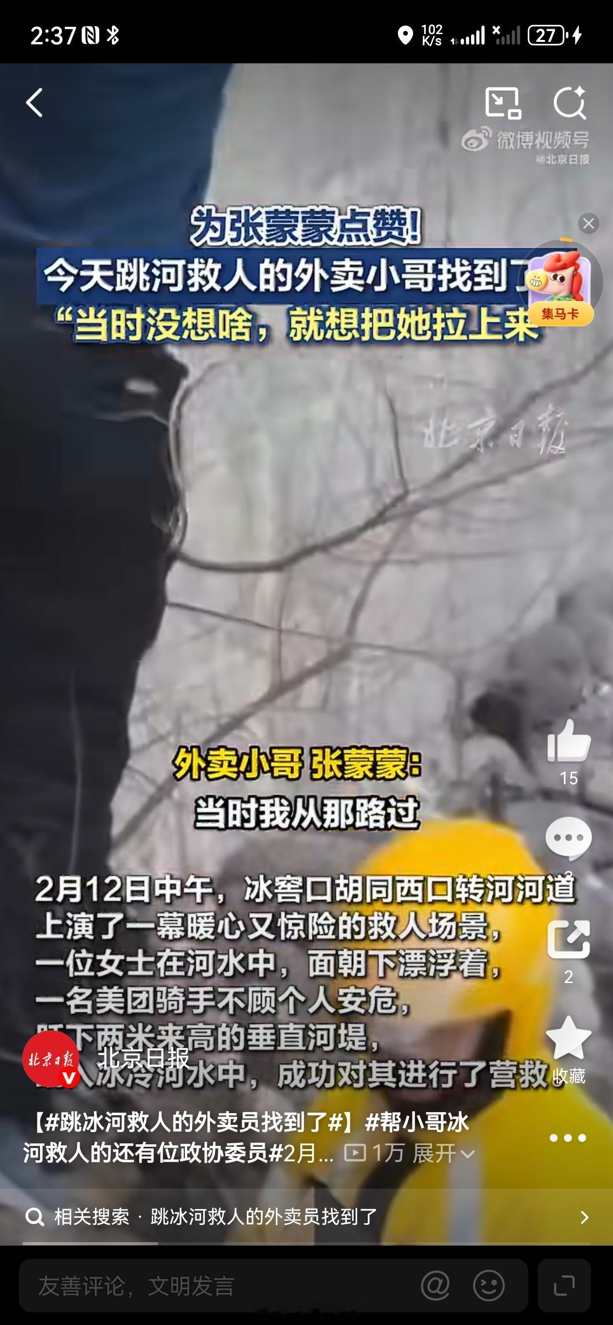 跳冰河救人的外卖员找到了2月12日下午,北京西城冰窖口胡同西口河道边,美团骑手张蒙蒙在送餐途中,发现有人落水。他来不及多想,纵身跃入刺骨河水。因堤岸高滑无法上岸,他在冰冷水中全力托举落水者,坚持到救援人员赶到,合力将人救起。确认安全后,浑身湿透的他默默离开,事后还不忘联系站点安排同事接力完成订单。一句“根本没空想,直接就跳了”,朴实却震撼,平凡身影挺身而出,温暖了整座城市。帮小哥冰河救人的还有位政协委员