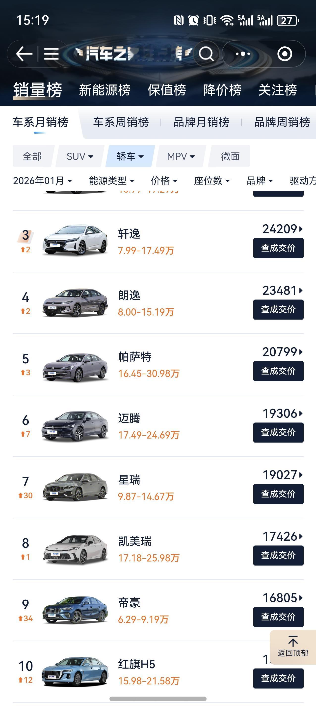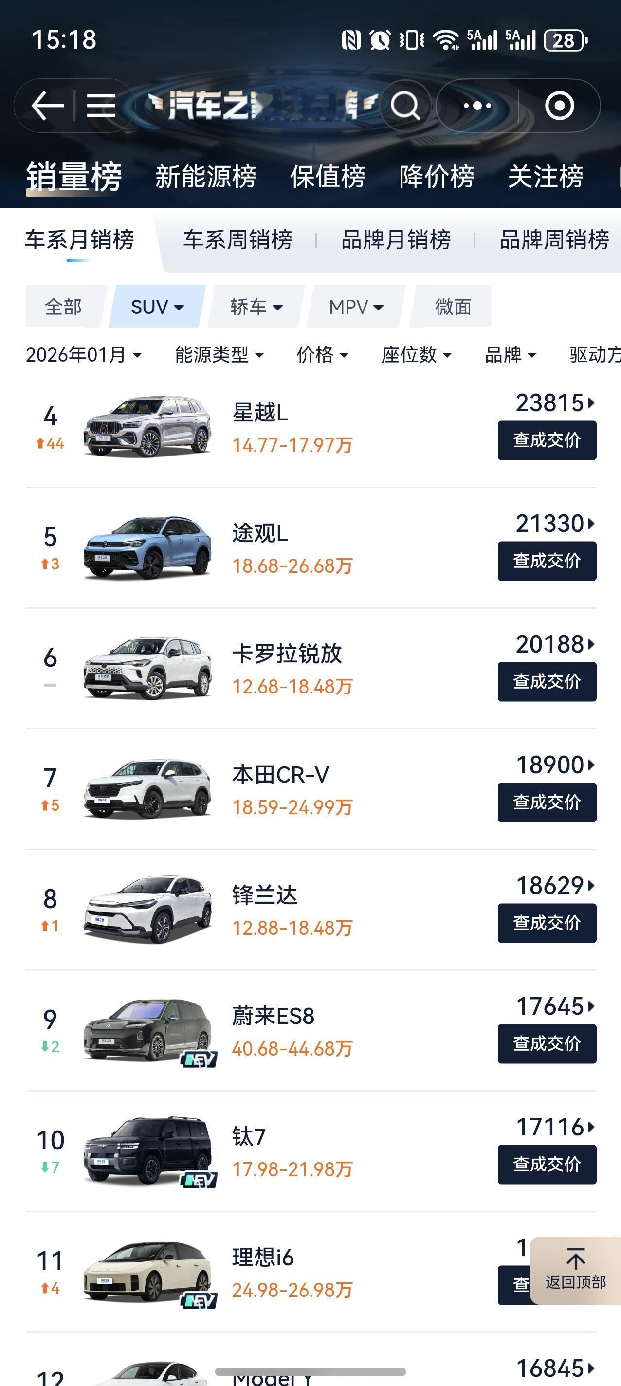 很难象想象,国产新能源龙头的比亚迪一月份的销量如此之惨。 所有车型分类当中,销量TOP10的车型,没有一款是比亚迪。 SUV分类,比亚迪销量最好的是宋Pro,排名二十开外了。(方程豹钛7排第十,也算是一根独苗。) 轿车分类,比亚迪销量最好的是秦plus,也是排名二十以上;之前常年占据销量榜第一的海鸥,居然只卖了5300台。 MPV分类,腾势D9排在第十一位,被高山和梦想家拉开了巨大的差距。 比亚迪的王朝海洋到底再搞什么幺蛾子。