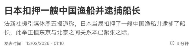 非常嚣张!日本对中国渔船进行扣押,并逮捕船长! 2月13日,日本海上保安厅在长崎县西南部海域扣押了一艘中国渔船,还把船长给带走了。 这一消息刚被法新社曝光,就马上引发了大量关注和讨论,根据日本渔业厅自己的说法,这艘中国渔船是在日本主张的专属经济区内作业,面对执法人员的命令没有停船,最后被日本扣下。 但这片海域的归属其实一直有争议,中国并没有承认日本单方面划定的专属经济区,让整个事件变得复杂起来。 大家都知道,现在中日关系本身就很紧张,两国在海上权益、历史问题等方面的争端不断,在这个时候日本做出这样的举动,难免让人觉得背后有别的考量。 日本选择在双方争议的海域动手,他们说是在自己的专属经济区里行使执法权,可实际上,这片海到底归谁管理,一直没个官方定论,中国方面始终没有同意过日本单方面划界,所以日本这么做,很容易被认为是在试图“既成事实”,给自家主张找依据。 国际社会早就有明确的规定,比如《联合国海洋法公约》就说得很清楚,在没有划定好界限的地方,单方面执法并不合法。 可是日本这一次还是强行行动了,这背后除了法律争议,恐怕还有不少政治考量,尤其是高市早苗政府近年来在对华态度上一直走得挺强硬,这种特殊背景下扣船逮人,带有很强的对外姿态。 回顾一下,上一次日本扣押中国渔船已经是2022年了,这几年虽然双方在海上磕磕碰碰,但都没有真闹到这么大动静,日本这次突然打破沉默,很大可能是想通过“硬碰硬”的做法巩固自己的海上权益,甚至给国内民众一个“强硬形象”的交代。 而且,这次事件发生地并不在最敏感的钓鱼岛以外,而是选择了长崎附近的海域,或许也跟日本有所顾虑有关。如果事情真发生在钓鱼岛周围,那性质可就完全不一样,很可能会激化双方矛盾升级。 中国的态度其实很明确,既然日本是在中方不认可的海域擅自执法,中国自然会表达强烈反对,通过外交去交涉,并要求放人放船。这也是中国坚持海洋权益时一贯的立场。 就在最近几年,中日之间的矛盾时不时就冒头,墙上有缝就生风,这次事件只会让两国本来就很脆弱的关系更加雪上加霜,想靠这种做法来逼迫中国让步,显然不现实,中国对于主权和海上权益,是绝对不会退缩的,这也是大家一直能感受到的态度。 很多人可能会好奇,为什么日本偏偏敢冒险这样做,其实,国际法虽然给出了大框架,但现实中,当法律没有办法完全解决的时候,一些国家就喜欢动用实际控制来加深各自的主张。 日本或许就是想借这次机会,试图增强自己对争议海域的实际影响力,但是如果中国默许,那么以后类似事情只会更多。 说到底,中日要想解决海上这些争议,靠单方面强硬或者执法肯定不行,最后还是得坐下来谈。但在没有解决之前,中国不会放弃捍卫自家渔民和海上权益。日本一味强硬,最终也只会让紧张局势变本加厉。