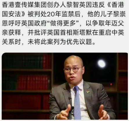 当黎智英被判了二十年,黎智英儿子坐不住了,在新加坡的媒体上喊话,他没指责中国,反而开始指责英国首相斯塔默了。 黎智英刚被羁押的时候,他儿子就把所有希望都寄托在了英国身上,专门远赴英国去奔走游说,找英国的相关人士沟通求情。 当时英国方面的态度格外热情,对着黎智英儿子拍着胸脯打保票,拍着胸脯保证,等首相斯塔默正式访华的时候,一定会把黎智英的案子当成重点事项提出来,还言之凿凿地说,只要英国出面交涉,黎智英大概率能被释放。 这番话让黎智英儿子喜出望外,觉得终于抱上了最粗的大腿,满心期待着斯塔默访华能带来父亲被释放的好消息,甚至已经开始盘算着父亲出来后的事情。 可现实却给了他当头一棒,斯塔默如期完成访华行程,期间和中方就双边合作、国际事务等诸多重要议题展开了务实沟通,双方的交流顺畅且有成效,整场访问下来,英国方面从头到尾都没有提及黎智英案,半个字都没提。 当初承诺得天花乱坠的英国,就像把这件事彻底忘了一样,之前的保证变成了彻头彻尾的空话,黎智英儿子盼了许久的希望,直接落了空。 英国之所以会开出这样的空头支票,根本不是真心想帮黎智英,纯粹是把他当成了一枚可以利用的政治棋子。 这些年,部分西方势力一直试图插手香港事务,总想拿乱港分子做文章,给中国制造麻烦,英国当时的承诺,只是做表面姿态哄骗黎智英儿子,压根没打算付诸实际行动。 英国政府比谁都清楚,香港是中国的特别行政区,中国对香港拥有完整的主权,黎智英案是中国的内部司法案件,任何外国都无权干涉,而且中国维护国家安全和香港法治的决心,从来都不会被外部势力左右。 更何况,英国自身面临着经济复苏乏力、民生问题突出等诸多难题,和中国保持稳定的双边关系,对英国的发展至关重要,他们根本不可能为了一个罪证确凿的乱港分子,去损害和中国的合作关系。 所谓的 “帮忙交涉”,从一开始就是一场骗局,只是为了利用黎智英事件制造舆论话题,达成自己的政治目的,用完这枚棋子,就毫不犹豫地抛在一边。 黎智英儿子敢公开指责英国首相,却不敢质疑中国的司法判决,核心原因很简单,黎智英的罪行铁证如山,根本无从辩驳。 这起案件历经 156 天的公开聆讯,法院核查了 2220 件证物、8 万多页文件,所有证据都清晰证明,黎智英长期勾结外国势力,在香港煽动非法集结、制造社会暴力,利用旗下媒体散播煽动性言论,严重破坏了香港的繁荣稳定,直接挑战了 “一国两制” 的原则底线,危害了国家主权与安全。 香港特区法院严格依照香港国安法和本地法律作出判决,程序严谨、公开透明,既保障了黎智英的诉讼权利,又坚守了司法底线,这样的判决合法合理、公平公正,任谁都挑不出毛病。 黎智英父子一辈子都想着挟洋自重,总觉得依附外国势力就能凌驾于法律之上,就能逃避应有的惩罚,却始终没明白一个道理,在国家主权和法律底线面前,任何外部势力都不值一提。 西方势力的所谓 “支持”,从来都带着功利性,只讲利益不讲情义,对他们来说,乱港分子只是用来干涉他国内政的工具,有用的时候甜言蜜语,没用的时候就弃之如敝履,半点信用都不会讲。 香港回归祖国多年,早已脱离了英国的殖民统治,中国治理香港的决心和能力毋庸置疑,任何妄图勾结外部势力、危害国家利益的行为,都必然会受到法律的严惩。 黎智英被判 20 年,是他祸国乱港的必然结局,而他儿子被英国忽悠后气急败坏的指责,更像是一场荒唐的闹剧,既改变不了既定的判决结果,也撼动不了中国维护法治正义与国家安全的坚定立场。 这件事也给所有心存幻想的人提了个醒,背叛国家、依附外部势力,从来都没有好下场,外国的承诺永远都是靠不住的空头支票,只有坚守家国底线、遵守国家法律,才是最靠谱的选择。 法治的公平正义不会缺席,国家的主权底线更不会退让,这是任何人都无法改变的事实。