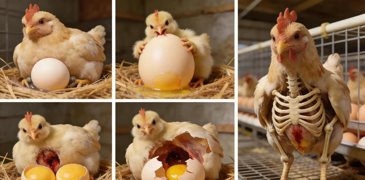 母鸡下蛋真的很疼吗?很多人觉得生蛋像人类生孩子那么撕心裂肺,但真相远没那么夸张。 正常情况下,母鸡产道弹性超强,蛋壳先软后硬,还有润滑液帮忙,顺产时基本就觉得有点胀,远不到剧痛级别。就像人顺畅拉肚子,没啥大碍。 真正要命的是蛋太大或畸形,直接卡住变成难产。尤其是刚开产的小母鸡,身体还没发育全,却容易憋出超大蛋,产道撕裂出血很常见。双黄蛋更狠,两个蛋黄挤一个壳,瞬间把出口撑到极限,粘膜外翻带血,疼得母鸡直哼哼。 最恐怖的还不是当下那几分钟,而是蛋在肚里碎掉。蛋黄蛋清漏进腹腔,引发卵黄性腹膜炎,细菌感染一来,死亡率极高,养鸡户一听那低沉用力呻吟,就知道得赶紧人工帮忙或抹油救命。 现代养殖更残酷,为了追求高产,蛋鸡被选育成一年下300多枚蛋,比野生祖先多十几倍。钙全拿去造壳,骨头天天透支,骨质疏松、胸骨变形成了常态。这种全年无休的骨头酸痛,比短暂产蛋疼多了,简直慢性折磨。 ,下蛋本身不至于要命,但人类为了多吃蛋,把鸡的身体极限反复拉扯,才让它们活得这么煎熬