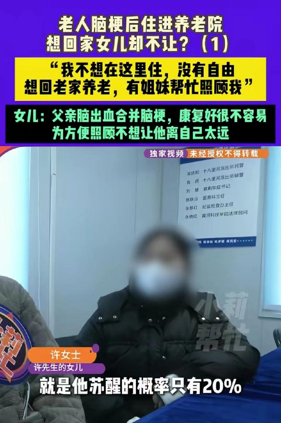 河南郑州,61岁大爷还脑出血并发脑梗,直接被送进ICU,医生说只有20%苏醒的可能,但在女儿和前妻的悉心照顾下,他竟奇迹般的康复了。女儿很后怕,便将他接到自己身边的一家养老院里,方便后期照顾,谁知,大爷却说自己在这里过得憋屈没尊严,非要回老家,让姐姐照顾他。姑姑年龄大了,女儿不想麻烦人家。谁知大爷竟多次闹腾,还怀疑女儿就是觊觎她每月5500元的退休金。 61 岁的许大爷是安阳人,几个月前被女儿接到了郑州的养老院里,但他住得一肚子委屈。 他向记者哭诉,自己每个月有 5500 元退休工资,可如今身份证和工资卡都被闺女拿走了,这让他觉得生活都没了保障,连想走都走不了。 原来,去年许大爷突发脑出血合并脑梗,情况十分危急,被送进了 ICU。 女儿许女士得知消息后,心急如焚,因为许大爷和妻子早年离了婚,但许女士的母亲还是不计前嫌,没日没夜地守在病床前。 许女士的丈夫、公公和婆婆也尽心尽力地伺候着。 医生当时说,许大爷苏醒的概率只有 20%,极有可能变成植物人。 也许是家人的细心照顾感动了上天,奇迹真的发生了,许大爷成功苏醒过来。 许女士看着父亲一点点好转,心里既欣慰又后怕。她心想,父亲好不容易醒过来,可不能再让他陷入任何风险了。 因为自己在郑州生活工作,而且刚好怀孕了,为了能更好地照顾父亲,她便把父亲接到了郑州的一家正规养老院。 这家养老院护理人员专业,离自己也近,方便随时去看望。 住了一段时间后,许大爷觉得自己的病已经好得差不多了。他心里琢磨着,自己现在吃药、锻炼、注意点就行,没必要再待在这养老院里。 他觉得这里一点自由都没有,每次一拿电话,护工就问给谁打电话;一上楼,护工就问上楼干啥去。 这让他感觉自己活得一点尊严都没有,心里憋屈得很。 许大爷从小跟姐姐一起生活,感情深厚,现在年龄大了,他特别希望,还能跟姐姐们在一起,大家相互搀扶着,这老年生活也就过去了。 哪怕住在安阳老家的养老院里,也比待在郑州这个人生地不熟的地方强,至少身边还有能说上话的人。 于是,许大爷跟女儿说自己想回家,而且说了不止 100 遍,可女儿就是不愿意,这让他实在想不通。 他觉得自己的病已经好了 80%,回家后照样能看病吃药、照顾好自己。他甚至开始怀疑,女儿是不是惦记着他那 5000 多的退休金。 听到许大爷的哭诉后,记者心里也犯嘀咕,怀疑是不是老人的病还没完全好,不具备回家的条件,所以女儿才坚持让他住在养老院。 毕竟养老院的护工更专业,有利于病情康复,可许大爷却一口咬定,自己已经好得差不多了。 为了弄清楚事情的真相,记者联系上了许女士。 面对父亲的质问,许女士特别难过。她向记者解释道,父亲之前患的是脑出血合并脑梗,情况危机,要不是家人细心照顾,父亲根本不可能醒过来。 人好不容易醒过来了,她实在不想再让父亲有任何闪失。 许女士还说,自从父亲住进养老院后,她经常去看望父亲,父亲想吃什么,她就给买,对他百依百顺。 她觉得自己已经尽到了做女儿的责任,可没想到父亲却如此不理解她,非要闹着回家。 对于父亲怀疑她惦记退休金的说法,许女士感到十分委屈。 她告诉记者,父亲现在光吃药每个月就要 1000 多块钱,再加上在养老院的费用,每月至少 3000 多。 父亲的退休工资可能刚够,要是再出个什么岔子,需要额外费用,都是她来支付的。 父亲住 ICU 的钱,也是她、公公婆婆和母亲一起掏的,那可是一笔不小的费用,但作为女儿,她照顾父亲本就是应该,自己没有怨言。 对于父亲说想和姑姑们住在一起的想法,但她觉得这并不是长久之计。 姑姑们年龄大了,都有自己的家庭,父亲现在病成这样,人家也得为他担惊受怕,她实在不好再给姑姑们添麻烦。 她希望父亲能安安稳稳地住在郑州,好好养病,不要再胡思乱想、闹腾了。 许女士说,她最想感谢的就是丈夫、公公婆婆和母亲,在他们怀孕又恰逢父亲生病的时候,全力帮助她,要是没有他们,她一个人真的挺不过来。 然而,许大爷还是坚持自己的想法。他觉得女儿有孩子还得工作,自己不想再麻烦女儿了。 他就是想回家,哪怕到家门口小区的养老院里也行。 许女士法同意,因为以他现在的身体状况,必须每天24小时身边有人待着,医生给出的结论是他有再次犯病的风险,而且极高。 而且,许大爷的姐姐表示,他现在一天给他打20多个电话,把自己的生活都搅乱了,她还是希望弟弟待着侄女身边。 《民法典》第35条规定:监护人应当按照最有利于被监护人的原则履行监护职责。 许大爷经评估具备完全民事行为能力,女儿擅自保管身份证、工资卡并限制其养老地点选择,超出合理监护边界。 但是,情和法不同,看得出来,女儿真的很孝顺,也是真心为他好,老人也该多体谅女儿的不易和担心,别寒了孩子的心。 最后,女儿无奈同意,等他康复之后,再送他回老家。