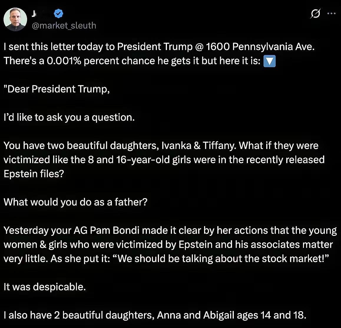 谁都有女儿,凭什么受害者就该被无视?这封公开信,戳穿了美式正义的遮羞布 一位美国父亲的公开信,直接把特朗普问得哑口无言。他没有激烈谩骂,只拿最朴素的父爱发问:如果受害的是伊万卡和蒂芙尼,你还会坐视不管吗? 司法部长轻描淡写把焦点转向股市,完全无视那些被侵害的孩子。这种冷漠,才是最让人寒心的地方。 每个孩子都是父母的命,权贵的沉默与敷衍,本质上就是对罪恶的纵容。嘴上喊着人权平等,真到了关乎底层受害者的时刻,全是双重标准。 所谓的公平正义,不该只给有权有势的人,更该照亮每一个受过伤害的普通女孩。 你觉得,这些受害者还能等到真正的公道吗?