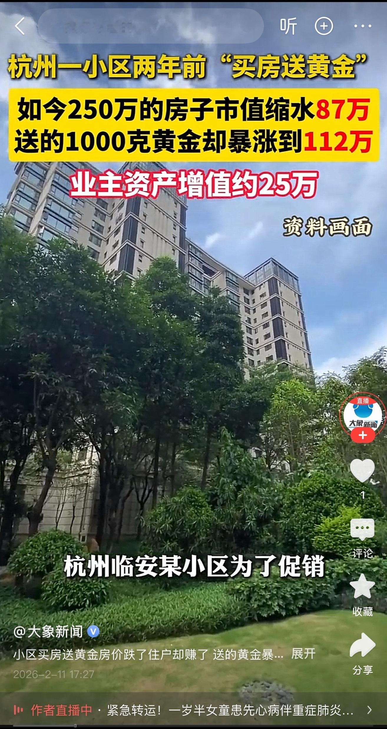 杭州一小区2年前促销,买房送黄金。