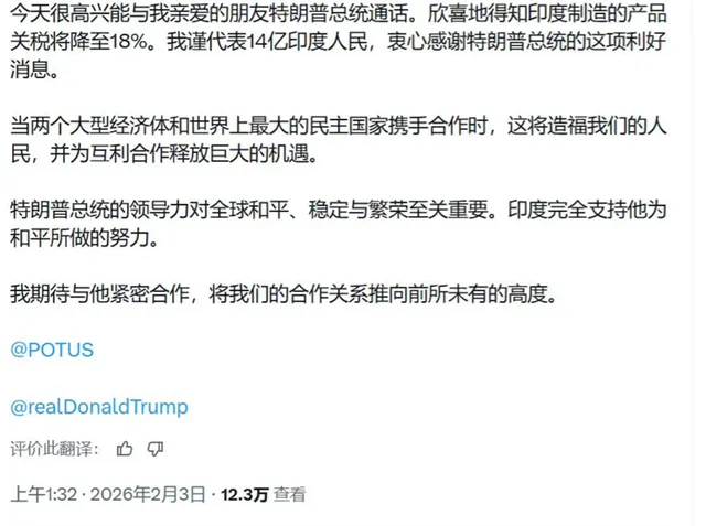 看起来是特朗普赢了,他用关税大棒,硬生生砸开了印度市场。但莫迪留了个心眼,他在社交媒体上感谢特朗普,称特朗普是“亲爱的朋友”,美国是“世界上最大的民主国家”,极尽赞美之词,但对采购美产品和停购俄油只字未提。