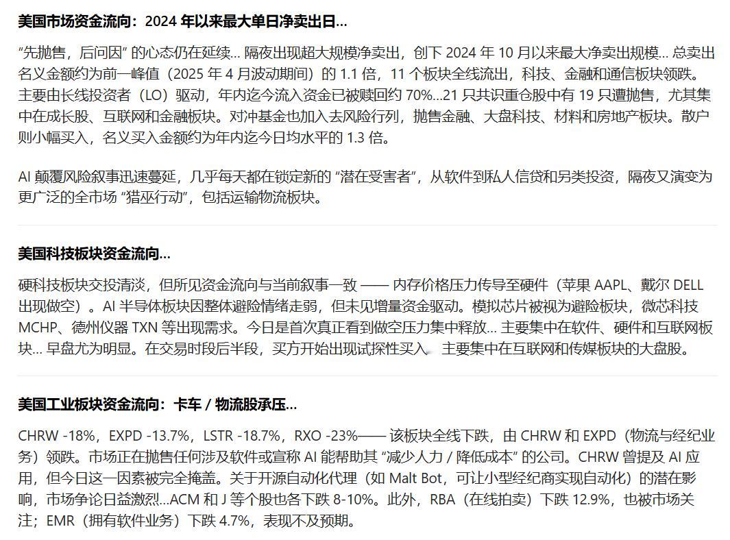 AI Disruption Risk narrative is spreading quickly & identifying new “potential victims” almost daily, from software to private credit and alts, and now turning into a broader market wide “witch hunt” including transport logistics overnight.