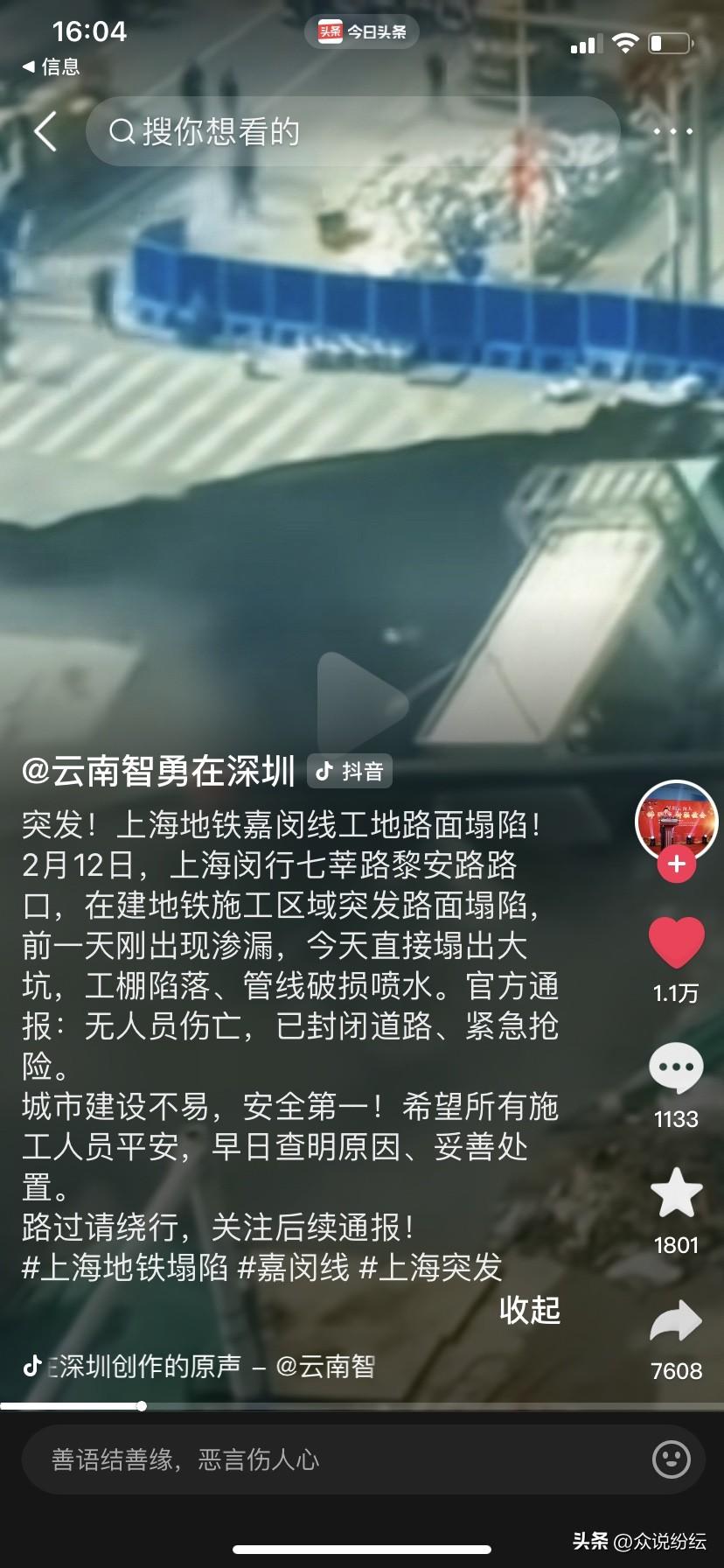 突发情况,上海地铁嘉闵线在建施工区发生坍塌事故。 2026年2月12日,上海地铁嘉闵线一在建工区发生坍塌事故,所幸没有造成人员伤亡。现场看到,由于路面大面积塌陷,工棚坠落,管线破损导致喷水,周围施工人员迅速撤离。 由于2月11日晚上该路段就出现了渗漏现象,已与对部分路段采取了封闭措施。 冰冻三尺非一日之寒。城市建设固然重要,但安全生产要永远放在第一位。希望相关部门尽快查清事故原因,修复道路,恢复通行。[祈祷][祈祷]