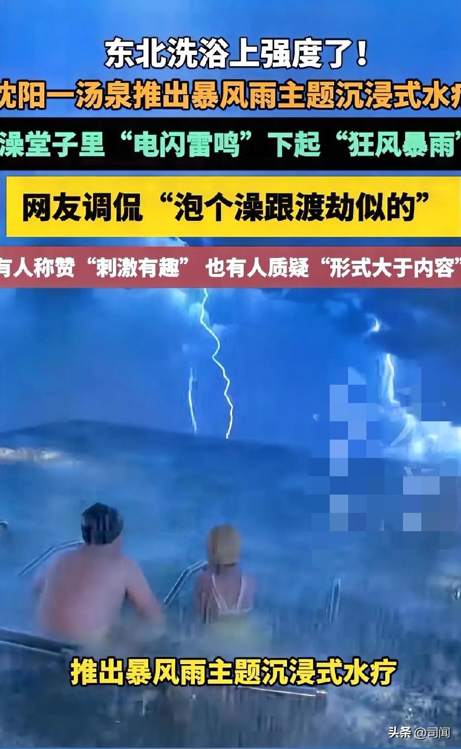 东北洗浴卷出新高度 沉浸式感受“电闪雷鸣”➕“狂风暴雨” 沈阳一浴池推出的套餐,游客表示“太刺激了,很有趣”还有人表示,我就泡个澡怎么像渡劫一样! 真是各行各业都在卷啊,这家洗浴是通过声、光、音的效果模拟出逼真的极端环境场景,你可以一边看闪电听暴雷,感受瓢泼大雨从头而下,天打雷劈也就这个效果了…… 有没有一类人幻想在雨天外淋雨并大声呐喊的?这家洗浴太适合你啦[呲牙],我觉得这想法还挺有趣的,但是千万做好用电防护措施,如果漏电了就是另一个故事了[捂脸]
