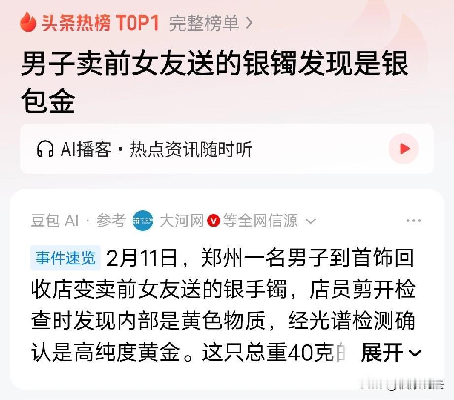 “终究是错付了!”郑州,男子拿前女友送的银手镯去换钱,剪开发现竟是“银包金”,是真金,金子有30克,银子才10克,男子目瞪口呆说:她从来没告诉我。一想到前女友,男子的心狠狠的痛了,几乎掉下眼泪,网友:后悔也晚了吧! 2月11号,男子来到一家首饰回收店,拿出前女友送的一只银手镯,打算把它卖了换点钱,估计他可能是手头有点紧,才动了卖旧物的念头。 按照店里的规矩,回收首饰得先验验货。 店里的师傅二话不说,抄起剪刀,“咔嚓”一下就把银手镯给剪开了。 这一剪可不得了,眼前的一幕,把在场的人都惊得目瞪口呆。 原本大家都以为这手镯是纯银的,谁知道里面竟然藏着黄金一样的东西,到底是不是还得验。 师傅那可是见多识广,一眼就看出是银子里包的很可能就是金子。 这就奇怪了,要知道,平常大家知道的都是金子包着银子,可这银子包金子的情况,那真是“打着灯笼也难找”,稀罕得很呐! 为了弄个水落石出,师傅赶紧用光谱检测了一番。嘿,还真让师傅猜对了,这黄色物质就是高纯度的真金! 再一称重,好家伙,这总重 40 克的手镯,金子竟然占了 30 克,银子才 10 克。 小伙子听到这个结果,也是嘴里直嘟囔:“我真是啥都不知道啊,她从来没跟我说过这里面是金子啊。” 现在这手镯里藏金的秘密一揭开,就像一把钥匙,打开了小伙子记忆的闸门。 这只银手镯是他分手的前女友送的,两个人是异地恋,因为种种原因,也是分了合,合了分,几次折腾下来,两人都坚持不住了,最后各奔东西了。 而今,这只前女友送他的银手镯,一下勾起那些和前女友在一起的甜蜜时光,像放电影一样在他脑子里转。 他大为触动,可能他此刻才明白前女友当时的良苦用心,以及对他的全心全意的付出,这一刻,他的眼眶都红红的,抽动着鼻子,眼泪差点就掉下来…… 在场店员看着小伙子这副模样,挺同情他的,看着也觉得心酸,纷纷感叹这感情的事儿有时候真是失去了才知道弥足珍贵。 有人说,离婚十几年,前妻的东西一样没动过,房门打开过一次,物品不知道怎么处理,无所谓了,反正老房子也没人住,看到他连前女友送的手镯都卖,震惊到我了。 银包金,隐意是“别在意表面,里子才是最好的”,可惜男方不懂,也不配拥有。 这个男的连前女友送的银手镯都要卖掉,可见这个男的多么的可恶,幸亏女孩分手了。 还有人说,女主一片真心错付,男的还伤感了一会儿,毕竟银价涨了,没想到里面居然是金的。正常人会选择送还回去或者深藏起来,什么人能想到拿去卖啊? 其实,这种真相最让人遗憾。 小伙子卖手镯,无论是经济还是心理上,说明他可能正处于人生的低谷,当他为了几百块钱准备剪碎过去时,却发现对方给他的远比他以为的多。 这种感情上的错位和对错失真心的自责,远比那30克的金子更让他揪心。 这事儿也让我们明白,爱情有时候就像这银镯藏金,表面看起来平平无奇,可里面却藏着无尽的深情。 我们在爱情里,不能只看表面,要多去感受对方的心意。也许那些没说出口的话、没表现出来的关心,才是最珍贵的。 同时,也要珍惜眼前人,别等到失去了才后悔。因为有些感情,一旦错过,就再也回不来了。 就像这小伙子,虽然发现了镯子里的秘密,可他和前女友的爱情却已经成为了过去式,只能留在回忆里慢慢回味了。 另外,前女友将银包金手镯赠与男子,男子接受了,赠与合同成立。 《民法典》第657条规定,赠与合同是赠与人将自己的财产无偿给予受赠人。 当小伙子接受了这只手镯时,所有权就已经完全转移到了他手中,也就是他的了,他怎么处置都是他的事。 前女友当时可能想的是,即便未来日子不好过,这东西也能在关键时刻帮他一把,而且,还没打算让他知道这份压箱底的付出。 但是,感情中,他确实没有前女友格局大。 对此你怎么看呢?