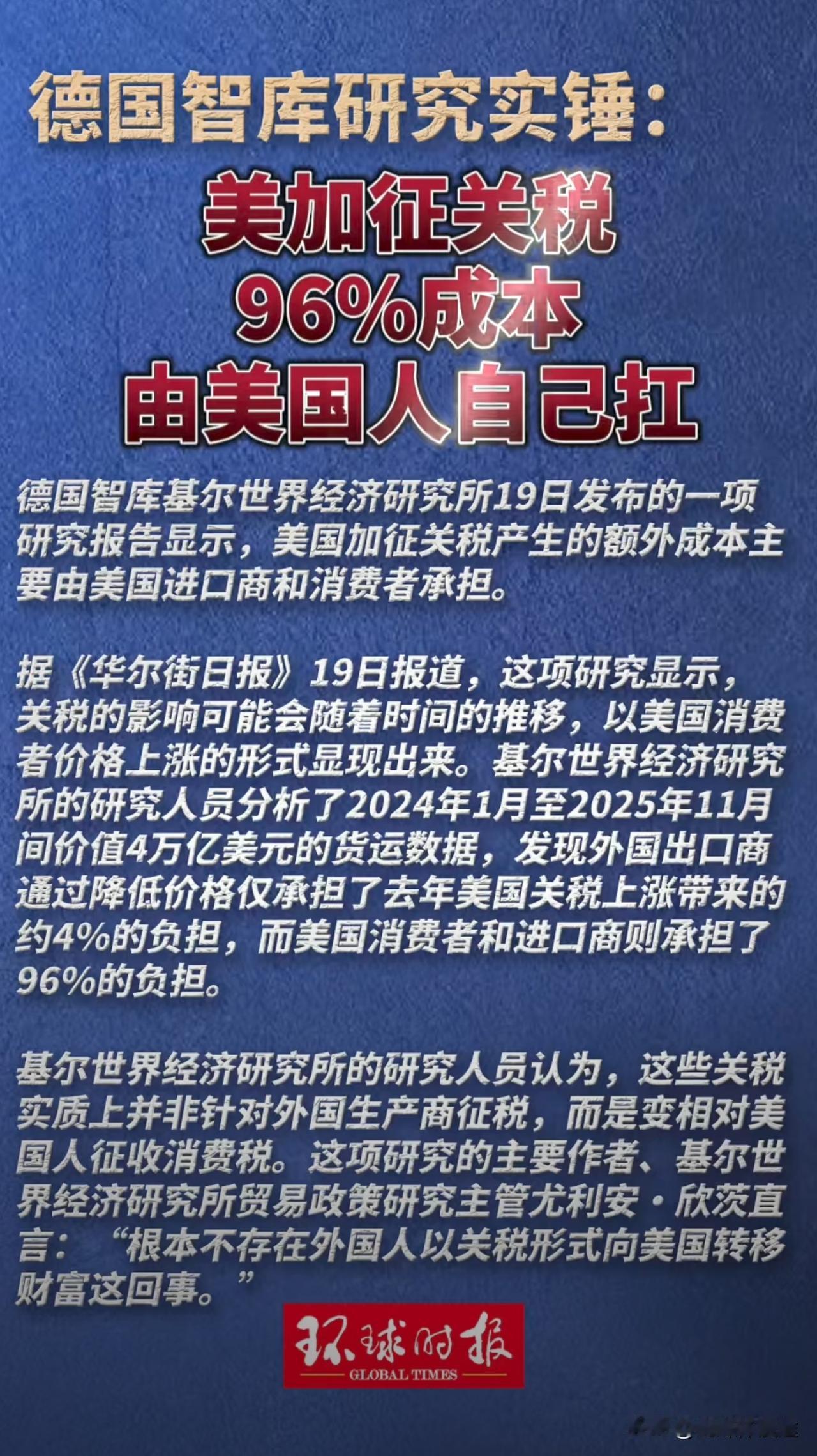 美联储报告:历经 11 个月的美国对等关税 事实上 90% 关税 都有美国消费者承当!美国贝长不敢承认 ,特朗普间接承认关税影响美国消费者 愿调低关税! 自 2025 年 4 月份特朗普发动了“对等关税”以来至今有 11 个月时候,而美国纽约联邦储备银行经过 11 个月的密切跟踪,发现一个事实:特朗普对等关税的提升关税率 ,已经有 94% 的关税实际的比例数额由美国消费者承担。也就是美国增加了关税而产生的费用,供货商以此提高了商品的单价,提高价格的部份将是关税的实际费用部份,并以此作为美国消费者实际购买的价格。 美国无党派智库税收基金会近日发表的一篇论文发现,特朗普关税相当于给美国家庭在2025年平均增税1000美元,在2026年平均增税1300美元。 对于美国关税的部分,在 2025 年 5 月份,美国财长贝森特在接 美国国会拷问:美国提升的关税 到底谁来支付?贝森特没有直接回答此问题,并表示:这是一个复杂问题,历史会证明谁将是最终的支付者!如此打马虎眼的回答,美国国会议员都看不下去了,并表示:这个问题并不复杂,只是你不敢说出是美国消费者来承担罢了。你只是在为特朗普打掩护而已! 所以就在特朗普对等关税之初,美国的金融界及美国的官员很清楚 这样的关税将大部份转嫁给了美国消费者承当!而事实历经 11 个月的美国关税运行的结果 表明事实是清楚的:美国消费者承当的关税有大部份! 另外 据《金融时报》报道,特朗普准备将出口到美国的钢铝关税下调,其中的原因,就是因为 50% 的关税而产生的钢铝价格大高,让美国消费者得益受损。这表明 50% 钢铝关税费用已经被摊到了钢铝实际的单价之中,成为了美国消费者支付费用! 所以当特朗普不断声称美国关税的提升 让美国挣得盆满钵满的,让美国成为世界最富有的国家。美国政府确实是收到了巨额关税,但这关税背后的实际承担者依然是美国消费者,而美国的对等关税反而加剧美国消费者的负担同时又加剧了美国制造业的危机:美国进口的商品或原料价格上涨之后加剧了美国生产的成本而转变为制造危机!