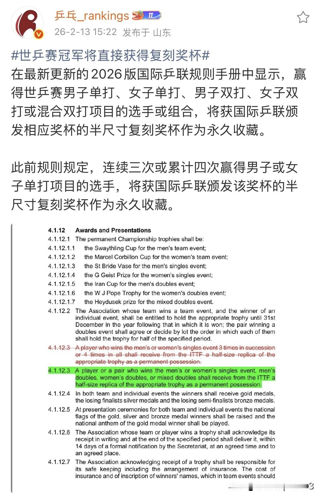 2026年开始,世乒赛冠军将直接获得复刻奖杯。 国际乒联最新公告,世乒赛所有项目,包括单打,双打,混双,将获得半尺寸的复刻杯, 以便大家收藏。 对比以前的连续三次或者累计四次,这确实是一个好消息。 多哈世乒赛,王楚钦,孙颖莎,单打和混双,都还没有给到复刻杯。 王楚钦孙颖莎的混双已经连续三次夺得冠军,按照以前的规定,也将会获得复刻杯。