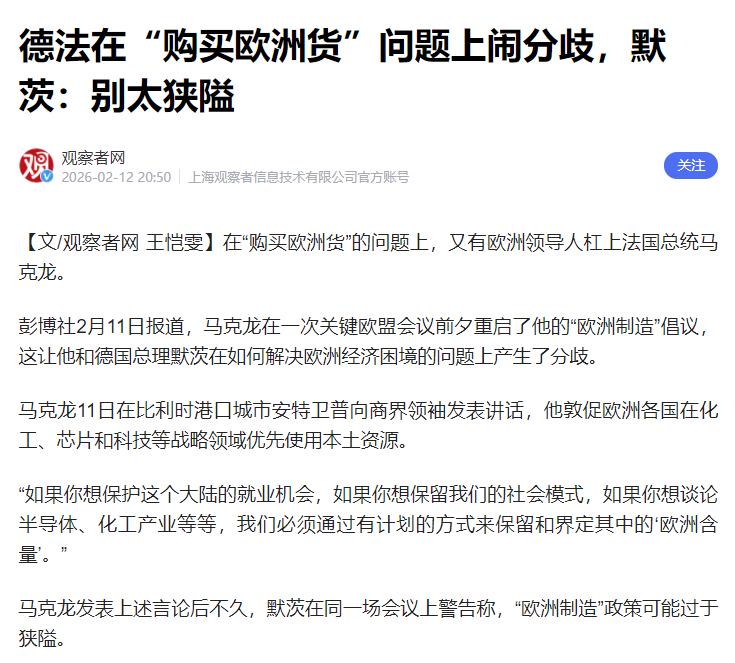德法又吵起来了! 马克龙要优先买欧洲货,默茨急了:别太狭隘 据彭博社2月11号报道。当时马上要开重要的欧盟会议,马克龙特意在开会前,跑到比利时的安特卫普,给欧洲做生意的大佬们讲话,核心就是说要重新搞“欧洲制造”。 他直白地要求,欧洲各国在化工、芯片这些重要领域,得多用自己本土的东西,多买自己造的产品。 马克龙说得很实在:想保住欧洲人的工作,想留住现在的生活方式,想把芯片、化工这些产业做好,就得搞清楚哪些是欧洲自己的东西,多优先用自己的,别总依赖外来的。 有意思的是,马克龙刚说完,默茨就在同一场会上唱了反调。他说,想法是好的,但这么做太狭隘了,真要是严格执行,不仅帮不了欧洲经济,反而会添乱。 有人可能会问,俩都是欧洲大国,都想让欧洲经济好起来,为啥想法差这么多?主要是两国的经济情况不一样,考虑的事儿也不同。 马克龙非要坚持买欧洲货,最根本的就是欧洲经济现在太差了,很多工厂不好做,工人容易失业。 法国的化工、芯片这些产业,不如别的国家有竞争力,企业日子很难过。他觉得,大家都买欧洲自己的货,就能保住工厂,工人不失业,老百姓的生活也能稳一点。 另外,他也不想让欧洲在这些重要产业上看别人脸色,怕被别人卡脖子。 而默茨反对,是因为德国和法国不一样。德国是工业强国,很多产品比如汽车、机械,都是卖到全世界的,靠出口赚钱。 他怕一味强调买欧洲货,别的国家会不高兴,也不让德国产品进去,这样德国企业就赚不到钱,工厂也会陷入困境,反而更不利于欧洲经济好转。 默茨觉得,解决经济问题,得多和别的国家合作,不能把自己关在欧洲内部。 不光默茨不赞同,欧洲还有不少国家也不认可,说靠这种保护政策救不了企业,还会让物价上涨,最后吃亏的是老百姓。 现在,欧盟已经开了会讨论这事,但因为德法意见不统一,其他国家也各有各的想法,没什么大进展。 后续欧盟还会再开会商量,能不能找到双方都满意的办法,还不好说。毕竟欧洲经济要好转,得大家一起出力,既保住自己的产业,也不能不和外面合作。