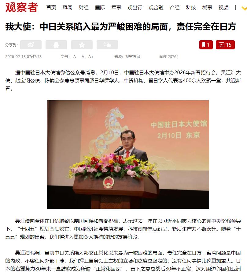 中方直言不讳: 中日关系现在非常危险! 据中国驻日本大使馆微信公众号消息,2月10日,大使馆办了2026年新春招待会。 400多位在日本的中国人、中资机构工作人员和留学生代表都来了,大家一起过年,本来挺喜庆的,但中国驻日本大使吴江浩,趁着这个场合,严肃说了当前的中日关系。 吴江浩大使明确说,现在中日关系,是两国建交以来最不好、最困难的时候。这话不是随口说的,大家也能感觉到,以前中日之间虽有不和,但还能好好说话、互相合作,做生意、民间来往也多。 可这几年,中日关系越来越僵,合作受影响,还总起摩擦,这事儿,责任全在日本,跟我们中国没关系。 这几年日本做了不少伤害中日关系的事,一次次碰我们的底线。比如日本新上台的高市早苗,嘴上说想和中国好好谈、改善关系,实际却一直在挑衅我们。 去年还说不少关于台湾的错话,甚至暗示要是我们解决台湾问题,日本可能会动手干涉,这就是管我们家里的事,伤了我们中国人的心。 不光如此,招待会结束没几天,2月12日,日本还强行扣了我们一艘中国渔船,抓了船长。 他们说我们渔船进了他们划的“专属经济区”,违反了他们的法律,但这个区域,国际上根本不承认,他们没资格在这儿执法。 而且这不是第一次了,去年他们还扣过中国台湾的渔船,这种挑衅行为,就是中日关系变差的重要原因。 另外,高市早苗政府还想改和平宪法,把自卫队改成正规军队,摆脱战后约束,周边国家都很担心。 吴江浩大使在招待会上也重点说了台湾问题,他说得很实在:台湾是中国的内政,外人不能干涉,我们保卫自己领土主权的态度,绝对坚定,没有比这更重要的事。 大家要记住,台湾自古以来就是中国的一部分,二战结束后就回到中国,这是改不了的事实。 吴江浩大使还提到,日本右翼势力80年来,一直想让日本变成所谓“正常化国家”,说白了就是觉得战后80年,日本不正常。 因为战后日本受和平宪法约束,不能有正规军队、不能发动战争,而右翼势力就是不想被约束,想重新拥有强大的军队。 大家想想,80多年前日本发动侵略战争,害了多少中国人、韩国人,现在他们又想摆脱约束,对周边国家、对亚洲和平,肯定不是好事。 面对日本的挑衅,吴江浩大使也亮明了我们的底气:中国有足够的能力、足够坚定的决心,保卫自己的核心利益。 这不是大话,这些年中国发展得越来越好,经济、军事都越来越强,能保护好自己的国家和人民。 大家也不用怕中日关系僵会引发冲突,我们中国一直爱和平,不想和任何国家闹矛盾。我们愿意和日本好好相处,但前提是日本停止挑衅,尊重我们的核心利益、尊重历史。 对我们普通人来说,知道这些事,就是明白国家强大了,我们才能不受欺负,才能安安稳稳过日子。