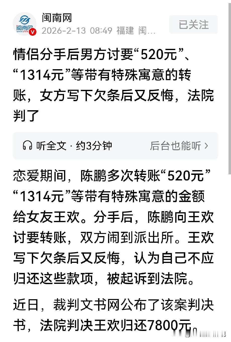 又一个白嫖的!湖南,一对情侣在热恋期间,男方曾给女友转账1314、520红包表达爱意。谁知,半年后两人分手了,男方立马翻脸,一算账,自己总共给对方7982元,他让女友立马还钱,女方拒绝,男方报警。经调解,女方写下7800元欠条,但又不想还,被男方告上法庭,而判决结果,令女子傻眼。 咱们都分手了,我给你的那些红包,必须还给我! 陈鹏找到前女友王欢,向她索要两人恋爱时,他转给对方的红包。 王欢也不示弱:那些红包,我没主动给你要,是你单方面赠予我的,你咋一点担当没有? 王欢扭头走了,她怎么都没想到,恋爱时,转账金额里藏着甜蜜密码。 分手后,这些带着爱意的数字,却成了双方扯不清的麻烦。 陈鹏和王欢起初只是普通朋友,2024年底,两人感情升温,正式确定了恋爱关系。 热恋期间,陈鹏对王欢特别好,平时嘘寒问暖,关怀备至。 常常在一些节日给她转账饱含深意的520元,寓意“我爱你”; 1314元,象征“一生一世”。 这些带着特殊寓意的转账,就像陈鹏对女友爱。 王欢每次收到男友的转账红包,都沉浸在甜蜜的爱意中。 但好景不长,这段甜蜜的恋爱仅过了半年,就出现了波折。 陈鹏翻看女友手机,偶然发现王欢和其他异性有来往,这让他心里像扎了根刺,十分难受。 而且,王欢还有个爱打麻将的习惯,陈鹏实在无法忍受。 他多次尝试和王欢沟通,希望她能为了两人的感情,改了这些坏毛病。 可每次沟通,都以争吵告终,两人之间的矛盾越积越深,最终,这段恋爱关系还是走到了尽头。 分手后,陈鹏心里越想越不是滋味。 恋爱期间,他真心实意地付出,仅半年,就给王欢转了那么多钱。 现在分手了,他觉得这些钱不能就这么没了! 他把自己手机里的转账记录加在一起。 还有两人在一起时的恋爱花销,看电影、吃饭都得算上,一分一厘也不能让她沾光。 他找到王欢,要求她归还恋爱期间的转账,一共7982元。 王欢认为,这些钱,都是陈鹏在恋爱时自愿给她的。 是表达爱意的方式,属于赠与,哪有分手后还要回去的道理? 再说,自己从来没给他要过一分钱。 王欢毫不犹豫地拒绝了陈鹏。 两人情绪越来越激动,谁也不肯让步。 最后闹到了派出所,经过调解,在民警的见证下,王欢无奈之下只好给陈鹏写了一张欠条。 欠条上写着:王欢欠陈鹏7800元整,本人在有钱期间会自觉慢慢还,以转账记录为证,定于2025年7月22日全部归还。 另外注明:陈鹏必须做到不能纠缠、威胁、恐吓对方及她家人朋友,从此以后彼此互为陌生人。 本以为有了这张欠条,事情就能顺利解决,可没想到,矛盾并没有就此平息。 到了约定的还款日,王欢却突然变卦,坚决拒绝还钱。 她觉得,这些钱本来就是陈鹏送给她的,是恋爱中的正常表达,不应该归还。 而且,她还一口咬定那张欠条是在无奈之下下写的,根本不是她的真实想法,所以欠条应该无效。 陈鹏觉得,王欢太不讲信用了,明明写了欠条,现在却反悔不还钱,这不是耍无赖吗? 他无法接受这样的结果,将王欢起诉到法院,要求他按欠条归还7800元。 法庭上,陈鹏拿出了详细的转账记录作为证据,证明自己确实给王欢转了7982元。 而王欢则辩称,这些转账发生在恋爱期间,是陈鹏单方面的赠与行为,不是民间借贷,所以她没有义务归还。 王欢声称欠条是在遭受威胁、恐吓的情况下书写,违背其真实意思表示,欠条应属无效。 她还四处寻找证据,试图证明欠条不是她的真实意愿。 法院经审理后认为,陈鹏在恋爱期间给王欢转账的7982元中,大部分都是是“1314”“520”这样有特殊寓意的金额。 从常理,和一般的观念来看,这些转账应该属于赠与。 毕竟,在恋爱中,人们常常会通过这种方式,来表达爱意和关怀,这是一种情感上的交流和付出。 然而,双方结束恋爱关系后,情况就发生了变化。 王欢在民警在场的情况下,亲自给陈鹏出具了欠条。 这就意味着,双方达成了新的合意,王欢同意退还陈鹏7800元。 而王欢声称,欠条是在遭受威胁、恐吓的情况下写的,违背其真实意思表示,欠条应属无效。 但她提供的证据,并不充分。 所以,应该认定,欠条是她真实意思的表示,合法有效。 《民法典》第657条:赠与合同是赠与人将自己的财产无偿给予受赠人,受赠人表示接受赠与的合同。 陈鹏给王欢转的“1314”“520”这些有特殊寓意的钱,明显是为了表达爱意,属于无偿赠与。 这种情况下,只要王欢接受了,这些钱就归她所有。 分手后,陈鹏本来没权利要求返还,因为赠与完成后一般不能反悔。 但事情的关键在于后来的欠条。 王欢在调解时写了欠条,这相当于双方达成了新的约定,把原本的赠与关系变成了欠款关系。 根据法律,只要欠条是在自愿、没有被胁迫的情况下写的,就具有法律效力。 最终,法院判决,王欢归还陈鹏7800元。 关注@赵哥的法律观