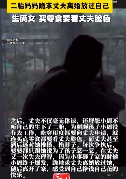 宁波,二胎妈妈小周,远嫁后为家庭放弃自我,却因二胎是女儿遭婆家冷待,丈夫不仅在月子期间对她不闻不问,还酒后家暴、严控家用,她买零食都得看脸色,最终崩溃求离婚,重获自由快乐。其实女性回归家庭没错,值不值得取决于男人的素质。全职妈妈劳动无价,却因“手心向上”被轻视,即便暂离职场,也要守住底气。 调解室惨白的日光灯打在桌面上,反射出一股冷冽的金属光泽。那里放着一枚崭新的金戒指和一个沉甸甸的金手镯。这是结婚七年来,丈夫小林第一次把这种象征“诚意”的东西摆上台面。 此时此刻,坐在对面的小周,目光或许在那堆黄金上停留了几秒,但脑海里炸开的画面,恐怕只有2024年那个令人窒息的瞬间——她双膝跪地,浑身发抖,向眼前这个男人哀求:“求求你,离婚放过我吧。” 一边是迟到了七年的黄金,一边是早已淤青的膝盖。这场婚姻的账,到底该怎么算?七年前,小周从老家远嫁到杭州、宁波一带,那是真正的“裸婚”。 没有婚礼仪式,没有彩礼,更没有所谓的“三金”。她带着一种近乎天真的孤勇,觉得只要有爱情和信任,那些俗气的物质都是多余的。 但这恰恰埋下了日后被轻视的伏笔。当婚姻褪去滤镜,露出残酷的权力博弈底色时,她才发现自己早已身陷囹圄。 真正的绞杀开始于二胎博弈。这简直是一个经典的家庭政治陷阱:婆婆曾是二胎最狂热的推手,日复一日地劝说。而丈夫小林因为生计压力,投了反对票。 夹在中间的小周,最终顺从了长辈的意志。可当命运揭晓二胎是个女儿时,婆婆的脸色瞬间垮了,原本承诺的育儿支持一夜之间撤资。 这时候,丈夫小林没有成为战友,反而开启了报复性的“清算”。在他看来,这个孩子的出生是妻子“不听话”的证据。 在小周坐月子最虚弱、最需要援手的时候,小林不仅不闻不问,依旧在外面喝酒娱乐。这不仅仅是懒惰,这是一种恶毒的惩罚——“是你非要生的,你自己养”。 孤立无援的小周,就这样被扔在了“重男轻女”和“决策报复”的夹缝里。她辞去了工作,成为了全职妈妈,这让她在家庭内部的地位彻底跌入谷底。 经济权的丧失,让尊严变得廉价且易碎。作为家里的后勤主管,小周连买包零食解馋,都需要向丈夫提交口头申请,并还要看对方那天的心情和脸色。 这种把人如蝼蚁般碾压的经济羞辱,比贫穷更折磨人。而当言语的打压无法满足小林的掌控欲时,暴力便成了他宣泄情绪的出口。 只要几杯酒下肚,推搡、掐脖子、砸毁家具就成了家常便饭。民法典里写得清清楚楚,月子里的冷漠是“遗弃”,酒后的拳脚是“故意伤害”,但在那个封闭的屋檐下,这只被视为家务事。 直到2024年那次失控的打砸,小周终于明白,忍耐换不来怜悯。她那一跪,不是认错,而是为了物理生存做出的最后博弈。她趁乱逃离,在外面租了房子,坚决分居。 如今在调解现场,看着丈夫递过来的金首饰,小周最终选择了收下。这大概是全场最令人唏嘘的一幕。 她收下,不是因为原谅,更像是拿走一份迟到的“遣散费”。她一言不发,拿走了本该属于她的东西,然后转身离开,拒绝复合。 现在的她,虽然工资不高,但每一分钱都是自己挣的。在那个简陋的出租屋里,她终于可以不用看任何人脸色,想买什么零食就买什么。