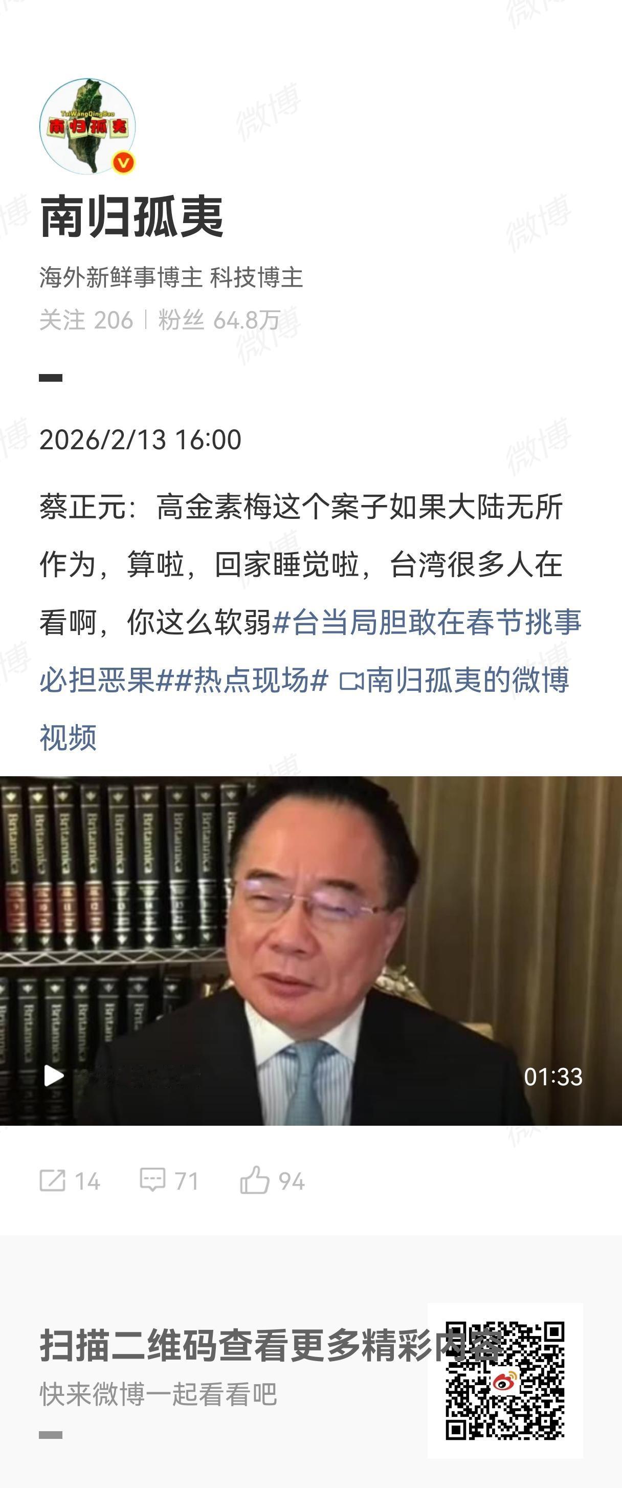 最近蔡正元博士的话风越来越奇怪,总结起来就是各种骂,今天又开骂了。在我的印象中蔡正元博士从来没有像邱毅、王炳忠和苑举正一样,明明白白地说自己是中国人,总是站在上帝的视角评判两岸关系,有时候捧、有时候踩,最近更是摆出一副“哀其不幸、怒其不争”的做派,在我看来就是在说风凉话。大过年的,听他这么说我很不开心。