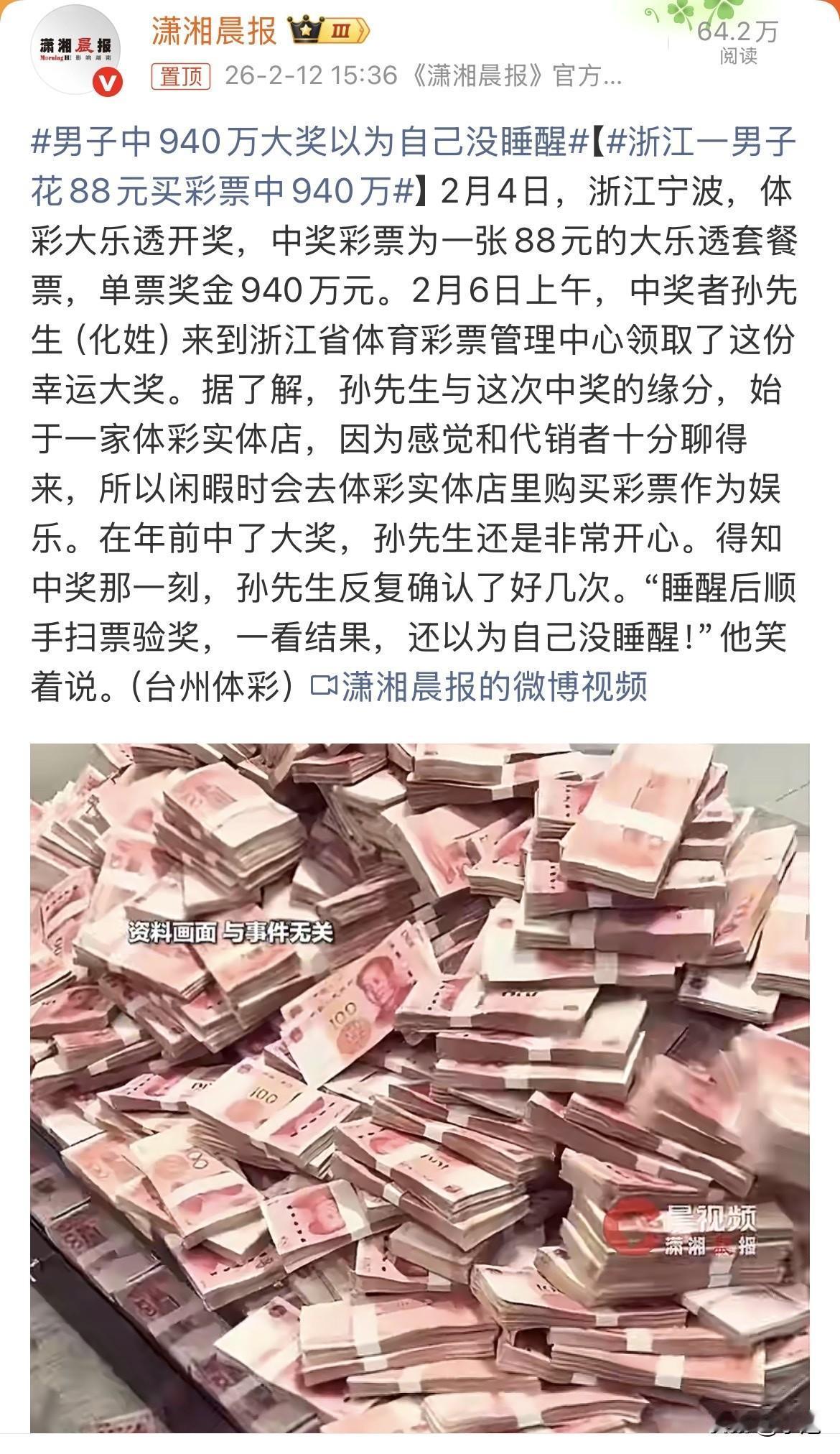 你敢信?大乐透940万,是孙先生大早上半梦半醒,躺在被窝里扫彩票扫出来的。 2月4号开奖,他压根不知道。 2月6号早上,他睡醒还迷糊着,摸过手机顺手一扫。 屏幕弹出来一串数字。 他揉了揉眼,以为是梦里那一套,没睡醒。 反复看了好几回。 940万。 就是自己花88块买的那张。 孙先生是宁波人。 他说自己平时不太玩大乐透,更爱买那种刮开就知结果的即开票。 那天纯属路过那家店,跟店老板投缘,平时没事就爱去坐坐。 刚好店里贴着套餐票海报,88块钱一张,他琢磨着也没几个钱,图个乐。 这一乐,乐出来940万。 其实很多人不知道,那张88块的“大乐透套餐票”挺有来头。 它不是一注号码,是打包票。 里面有5注单式,再加一组“7+2”复式,还加一组“6+3”复式。 等于说花一份钱,里头装了三个不同类型的投注方案。 江苏之前好几个中千万的,买的都是这款。 孙先生那天压根没想这么多。 看海报顺眼,买了。 塞进抽屉,忘了。 两天后早上一睁眼,顺手一刮。 940万。 他说领完奖捐了两万。 给浙江省体育基金会一万,青少年发展基金会一万。 剩下的他说要好好规划,给未来多点保障。 这话说得滴水不漏。 最让人心里不是滋味的,是他讲的那句—— “反复确认了好几次”。 这句话翻译过来就是:压根不信。 好事砸头上,第一反应不是高兴,是怀疑。 其实想想也对。 普通人跟巨款之间,隔着的根本不是运气。 是认知。 你不信它归你,它真来了你也不敢认。 网上好多人说,这哥们上辈子积德了。 可你看看他干的事—— 跟代销者聊得来,常去坐坐,顺手买一张。 这不就是过日子吗? 积什么德,他就是没把这事当事儿。 偏偏就是这种不当事儿的,中了。 还有个细节。 孙先生说,那天是看到套餐票海报,觉得“既有趣又划算”。 不是“感觉今天运气好”,不是“最后一搏”,也不是“不中拉倒反正图个希望”。 就是——有趣,划算。 跟买包烟,买杯奶茶,没什么区别。 这就是最扎人的地方。 真中奖的人,没一个是在赌。 他就是在生活。 顺手买个乐趣,顺手扫个票,顺手接住940万。 而那些天天研究走势图,期期不落,勒紧裤腰带追加的,连个末等奖都少见。 评论区很多人说,这下孙先生全家能过个肥年了。 他领奖是2月6号,腊月十八,离过年还有十来天。 确实是肥年。 但他说完“多一份保障”之后,再没多讲一个字。 没说要换房,没说要换车,没说带老婆孩子去哪玩。 就一句:给未来多一份保障。 中年男人的保障是什么? 无非就是孩子学费、父母看病、房贷月供、万一失业了还能撑两年。 940万在宁波,干不了什么惊天动地的事。 但能让一个普通人家,往后二十年,晚上睡得踏实。 这笔账,他算得比谁都清。 有人问他什么心情。 他说,睡醒扫出来,以为自己没睡醒。 这句话当天就上了热搜。 底下好几万点赞。 点赞的人不是在羡慕钱,是在羡慕那种感觉—— 人活着,偶尔被老天爷摸一下头。 哪怕就一下。 所以问题来了—— 你早上睁开眼,第一件事是摸手机。 他早上睁开眼,摸一下手机,变940万。 差的真是一张彩票吗? 你平时也买。 买完也扫。 扫完也扔抽屉。 扔完也忘。 可你就是没中。 孙先生自己都说了,他那天是随手,平时压根不买大乐透。 那你说,940万选他,到底是凭什么呢? 这事你怎么看? 是运气来了挡不住,还是有些人的福气,就藏在没当回事的那88块钱里?