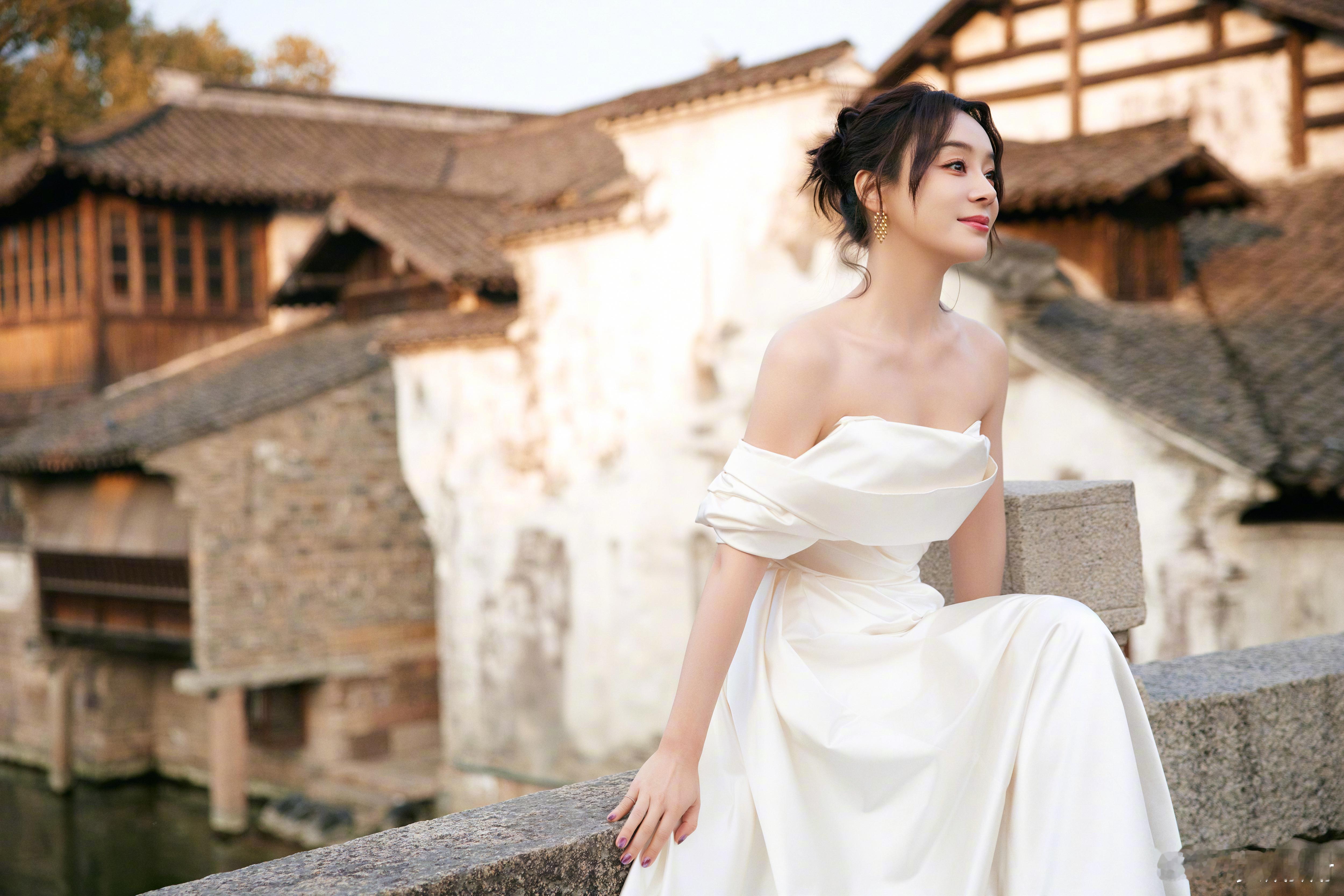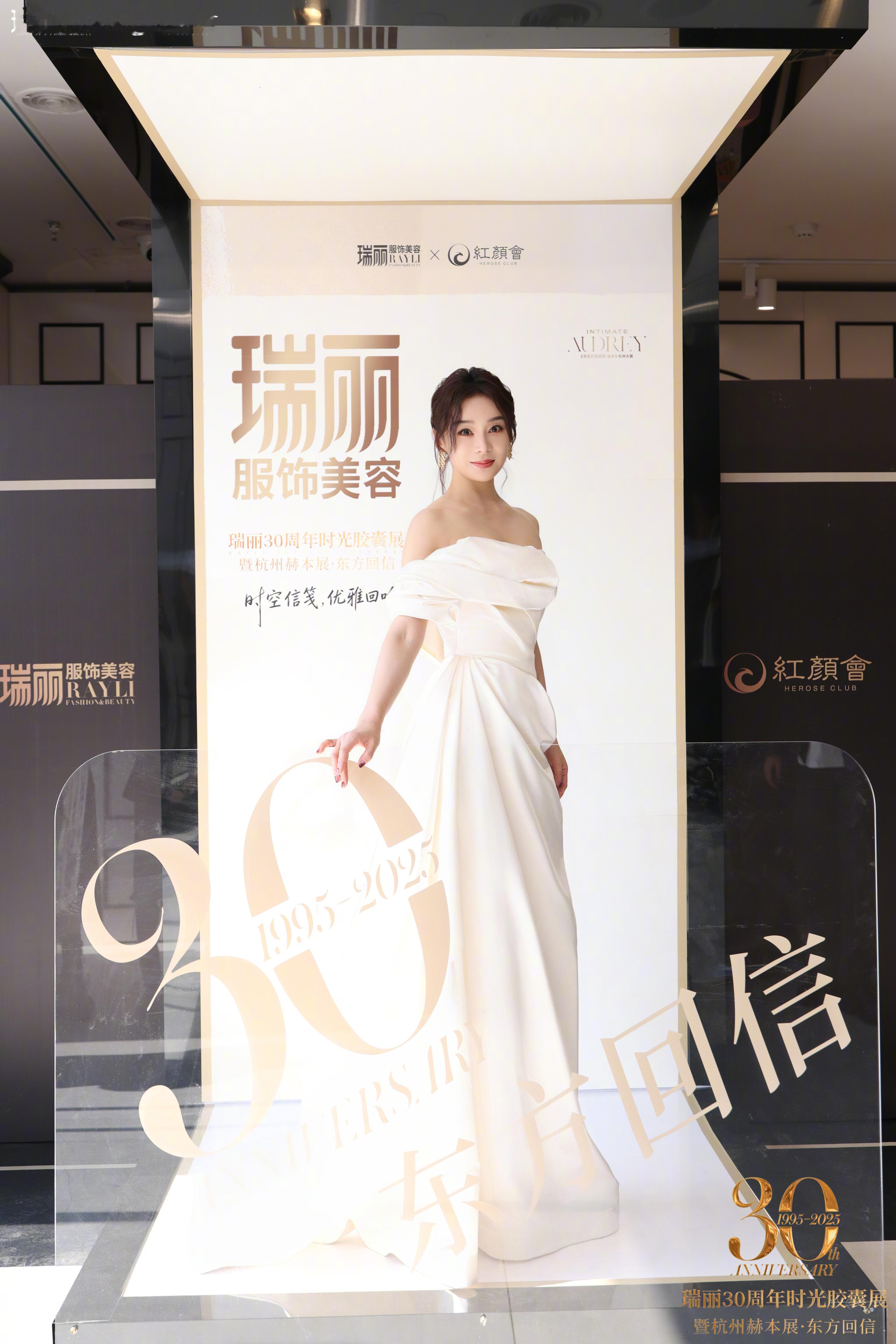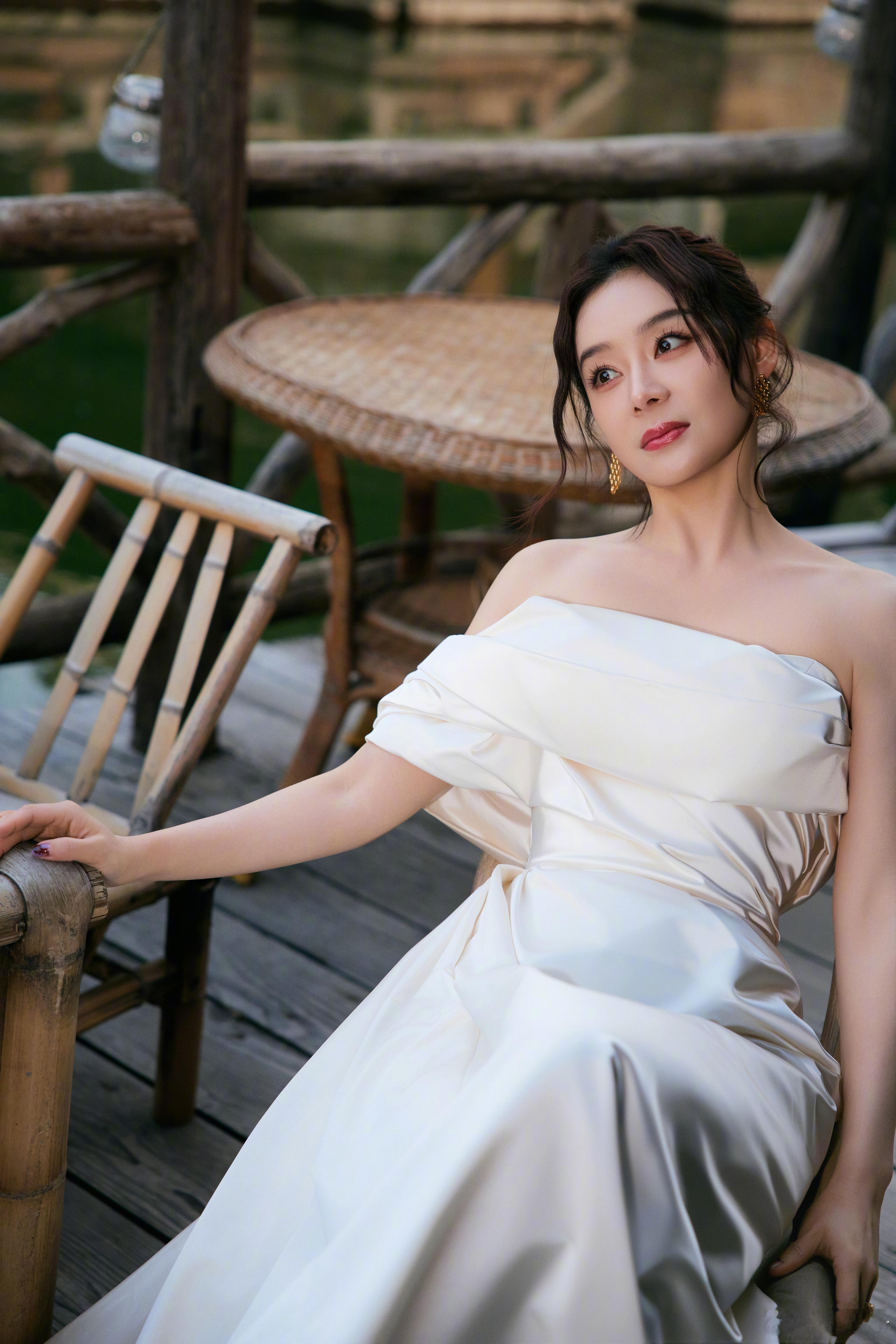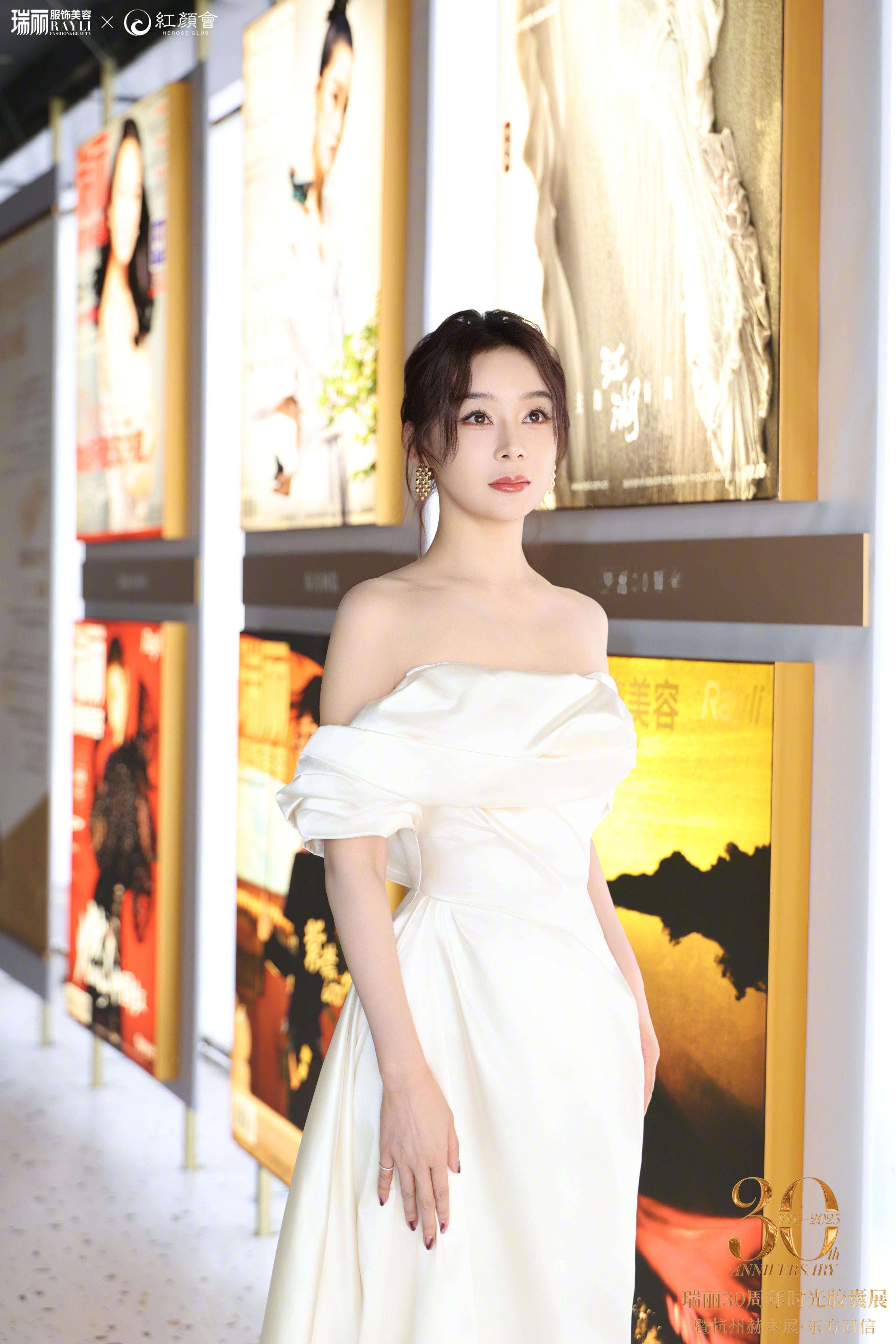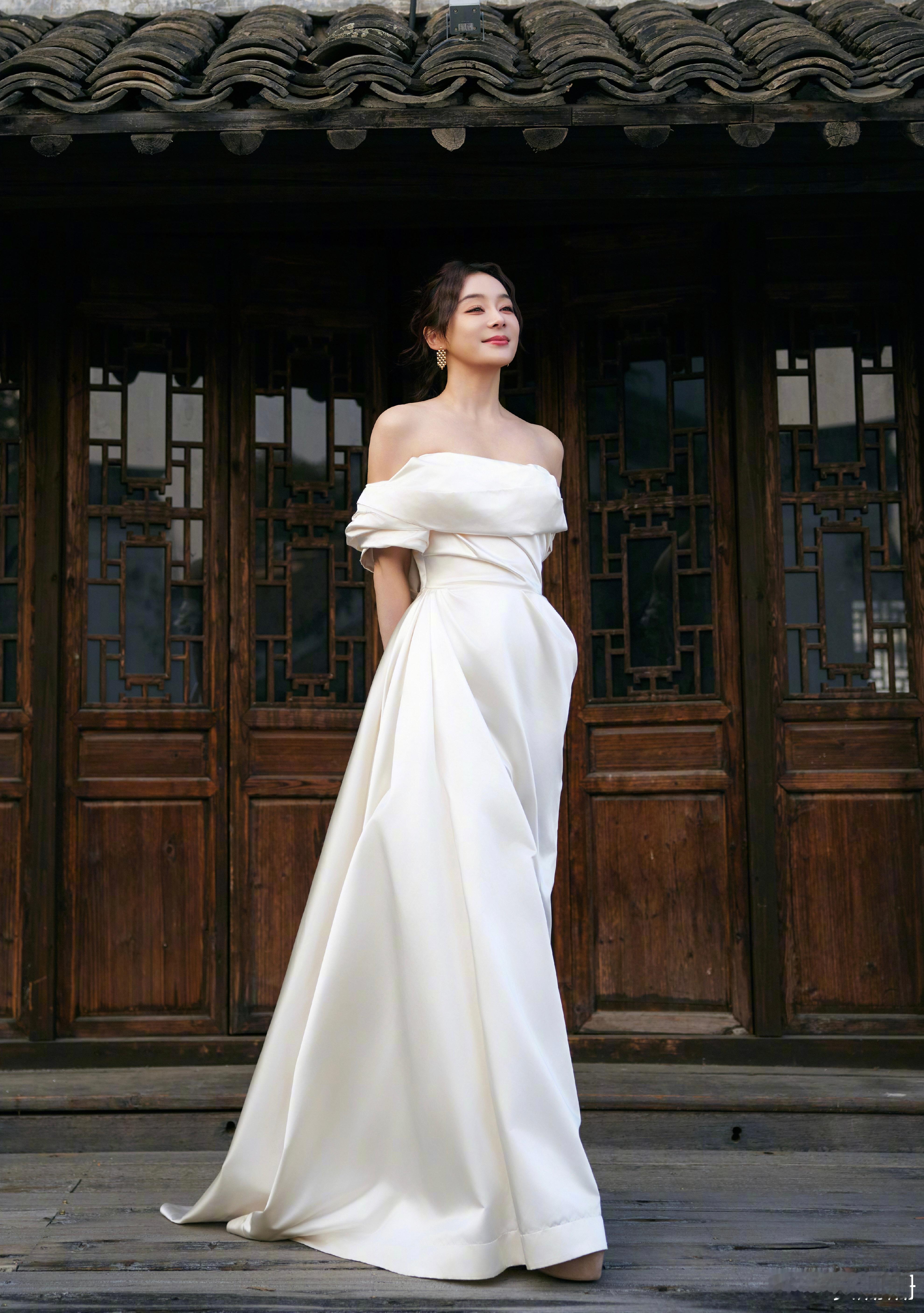 袁姗姗 白缎一字肩礼服,垂坠的缎面衬得肩颈线条如天鹅般优雅,极简剪裁却自带高光。