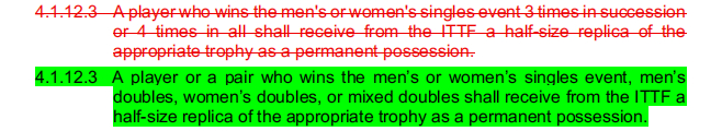 在世乒赛男子单打、女子单打、男子双打、女子双打及混合双打项目中夺冠的运动员或组合,均可从国际乒乓球联合会(ITTF) 获得对应奖杯的半尺寸复制品,作为永久纪念品。