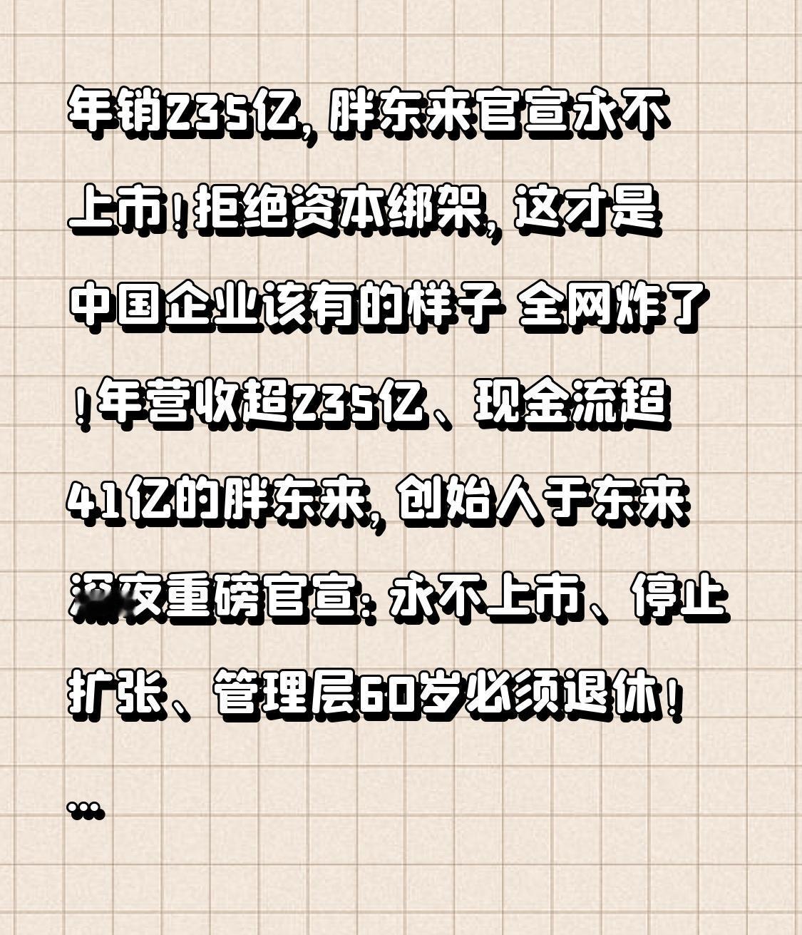 年销235亿,胖东来官宣永不上市!拒绝资本绑架,这才是中国企业该有的样子 全网炸了!年营收超235亿、现金流超41亿的胖东来,创始人于东来深夜重磅官宣:永不上市、停止扩张、管理层60岁必须退休!在人人抢着上市、拼规模、追市值的今天,胖东来偏偏反着来,到底凭什么? 很多人不解:放着几十上百亿的融资不要,放着全国开店的机会不做,胖东来是不是傻?资本市场多次抛来橄榄枝,投行排队等着合作,于东来只回一句:胖东来是学校,不是赚钱机器。 转折来了!胖东来不上市,根本不是没钱,而是不想被资本绑架。一旦上市,就要对股东负责、追高增长、压成本、砍福利,那还是我们熟悉的胖东来吗?免费修鞋、免费加工、无理由退换、给员工高薪高福利、把顾客当家人,这些暖心细节,一旦被资本裹挟,大概率都会变味。 于东来定下铁律:胖东来永远做学校式企业,分享理念与技术,不做资本逐利的工具;完成样本目标就停止扩张,不盲目开店;管理层60岁前必须退位,保持团队年轻活力。别人卷规模、卷利润,胖东来只卷人心、卷温度、卷善良。 从40平米小店到零售标杆,胖东来把“真诚”刻进骨子里。不玩套路、不割韭菜,对员工大方、对顾客实在、对社会负责。别人关店是亏损,胖东来关店是怕品质跟不上;别人上市是为了赚更多钱,胖东来不上市,是为了守住初心不变。 这才是最让人破防的地方:商业不该只有逐利,更要有良心与底线。胖东来用行动告诉所有人,好企业不一定要上市,不一定要做到全国第一,守住初心、善待员工、温暖顾客,比什么都重要。 我们总在快节奏里焦虑,在浮躁中迷失,而胖东来让我们看见:慢一点、真一点、善一点,反而走得更稳、更远。它不只是一家超市,更是一股清流,一种值得尊重的商业信仰。 为胖东来的清醒与格局点赞!愿中国多一些这样有温度、有底线、有初心的好企业,也愿我们都能在平凡生活里,守住真诚与善良,遇见不期而遇的温暖。