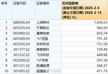 蛇年十大牛股正式出炉。剔除2025年之后上市的新股,蛇年涨幅排名前十的个股依次是:上纬新材、天普股份、嘉美包装、*ST亚振、宏和科技、鼎泰高科、飞沃科技、*ST宇顺、胜通能源、超捷股份。