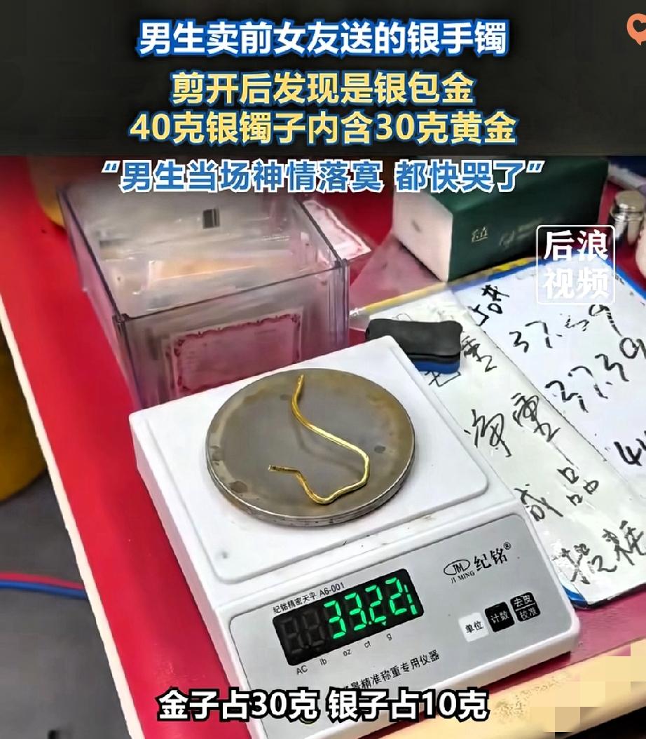 一剪刀下去,剪断的不仅是手镯,更是一个姑娘藏了很久的真心! 男子缺钱,把前女友送的银手镯拿去变卖,本以为只是个普通镯子,剪开才发现,里面藏着足足30克足金。 他瞬间愣住,没有暴富的喜悦,只有满心的后悔和心酸。 姑娘从不说多爱他,却把最实在的温柔裹在手镯里,就怕他哪天走投无路,能靠这个渡过难关。 很多人说他难过,是因为再也遇不到这么掏心掏肺对他的人。可真正的遗憾,是他直到失去,才看懂那份沉默又厚重的爱。 钱能解一时之急,可那个满眼都是你的人,一旦弄丢,就真的再也回不来了。 你觉得他是可惜钱,还是可惜人?换作你,会卖掉这份心意吗?