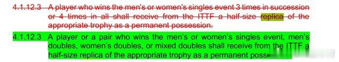 中国乒乓球梦之队 根据国际乒联规则2026(ITTF STATUTES 2026),单项世乒赛男女单打参赛名额做出调整。原规则规定一个协会可选男女各3名球员参加单打比赛,另外如果有世界排名100位之内的多增加一个名额,如果有世界排名20位之内的再增加一个名额。也就是单个协会最多可以派各5名选手(3+1+1)参加男女单打比赛。新规则又规定——符合以下任一标准的单打选手除外:(i)是单打比赛的现任世界冠军;或(ii)现任单打世界杯冠军。此外,世乒赛各单项冠军将直接获得1/2尺寸的奖杯复制品永久保存。世乒赛