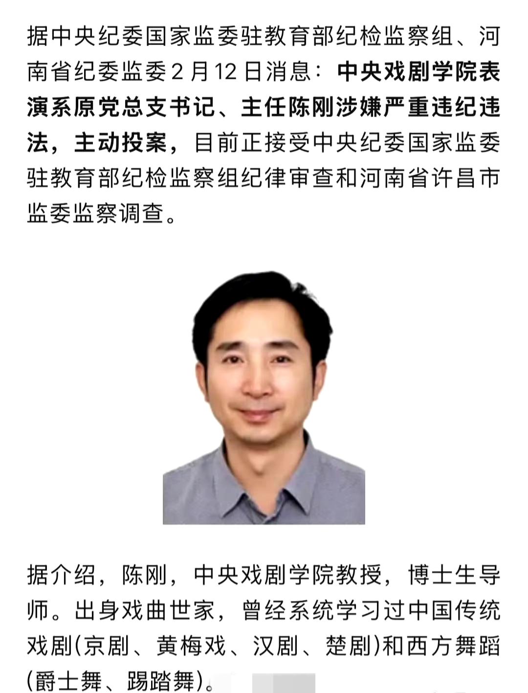 当中央戏剧学院表演系原主任陈刚主动投案的消息传来,整个娱乐圈都屏住了呼吸。 这位出身戏曲世家、桃李满天下的教授,曾是无数艺考生心中的“引路人”,也是《新桃花扇》等作品的导演。 如今他因涉嫌严重违纪违法接受审查,不仅让中戏的声誉蒙上阴影,更让人们对艺术院校的权力生态,产生了新的思考。